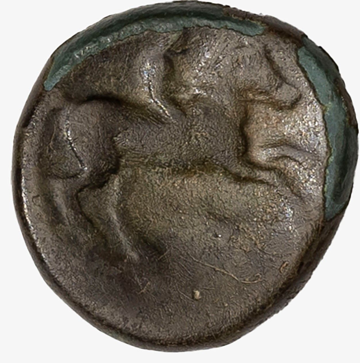 D/ testa di Apollo a s., R/ giovane a cavallo a d., in basso un fulmine verticale, Zecca di Siracusa, Rif. bibl. Cfr. SNG ANS, Part 8, 839, 880-4; Cfr. SNG, Alpha Bank, 427; Metallo: AE, gr. 6,52, diam. 17,27 mm., MB