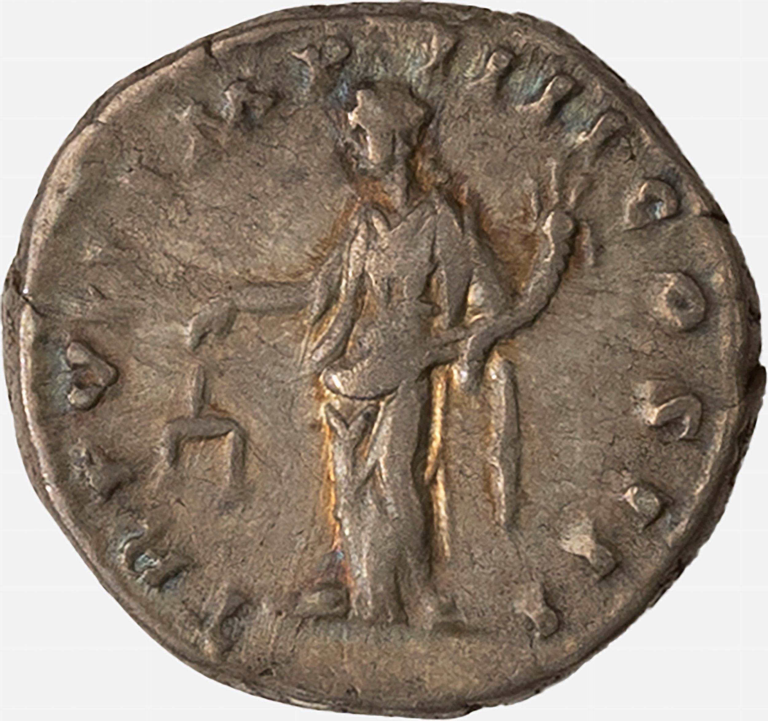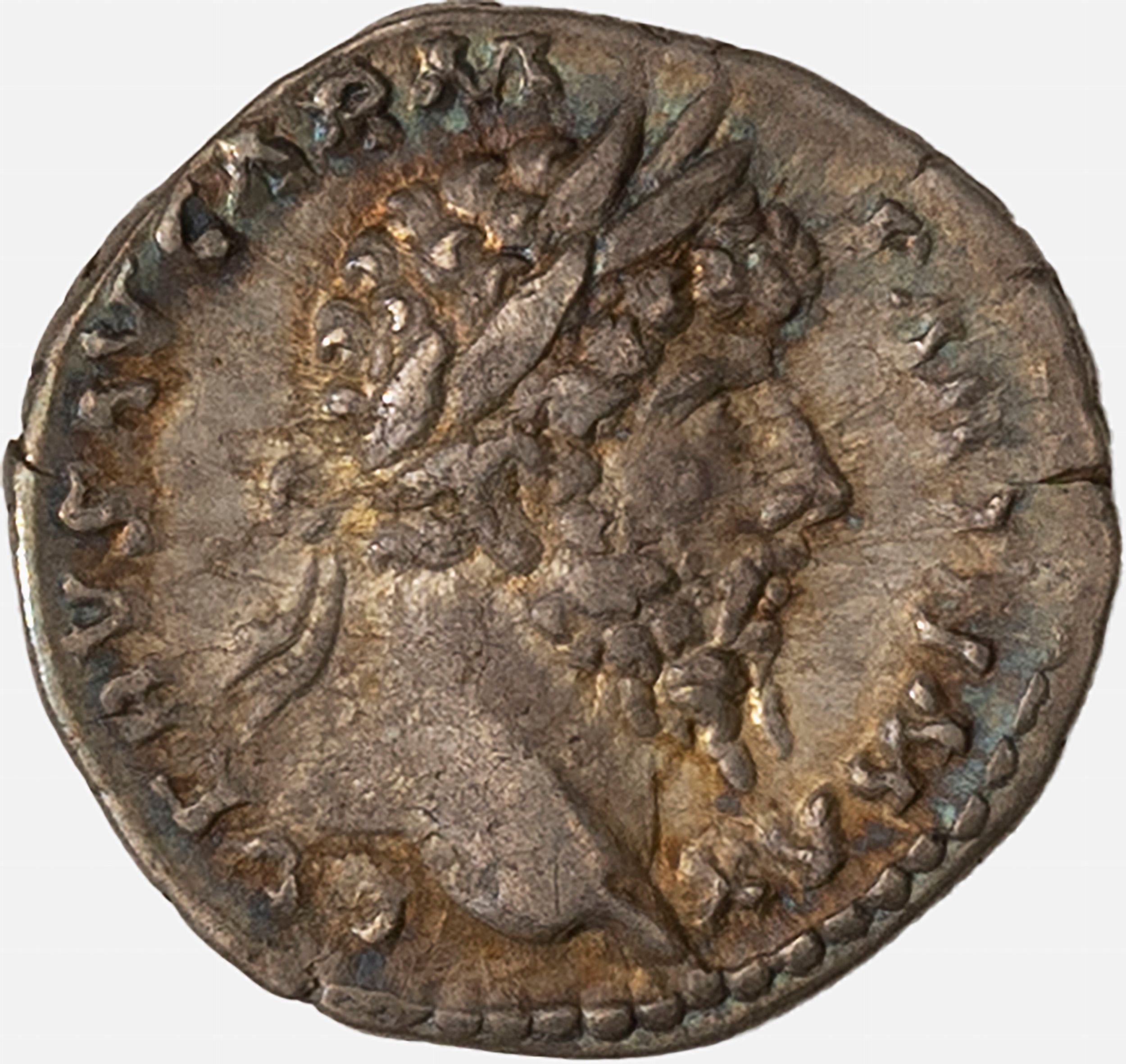 D/ testa laureata dell'Imperatore a d., R/ la Aequitas seduta a s. regge una bilancia con la mano d. e una cornucopia con la s., Zecca di Roma, Rif. bibl. RIC III, n. 576, p. 260; Metallo: AR, gr. 3,38, diam. 18 mm., mBB