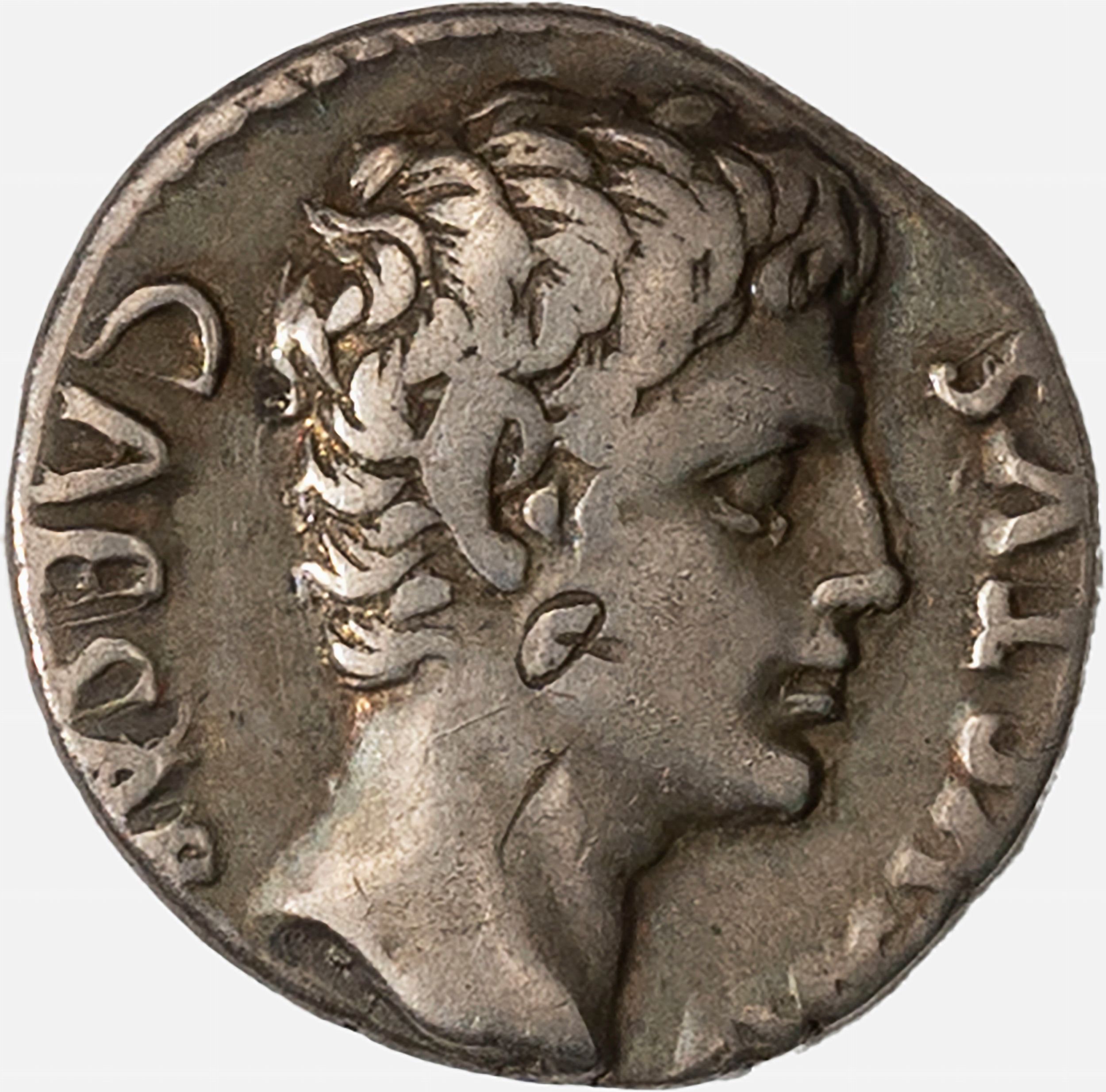 D/ testa dell'Imperatore a d., R/ scudo circolare affiancato a s. da un'aquila legionaria e a d. da uno stendardo, Zecca di Colonia Patricia, Rif. bibl. RIC I, 2 ed., p. 47 n. 86a; Metallo: AR, gr. 3,58, diam. 18 mm., mBB