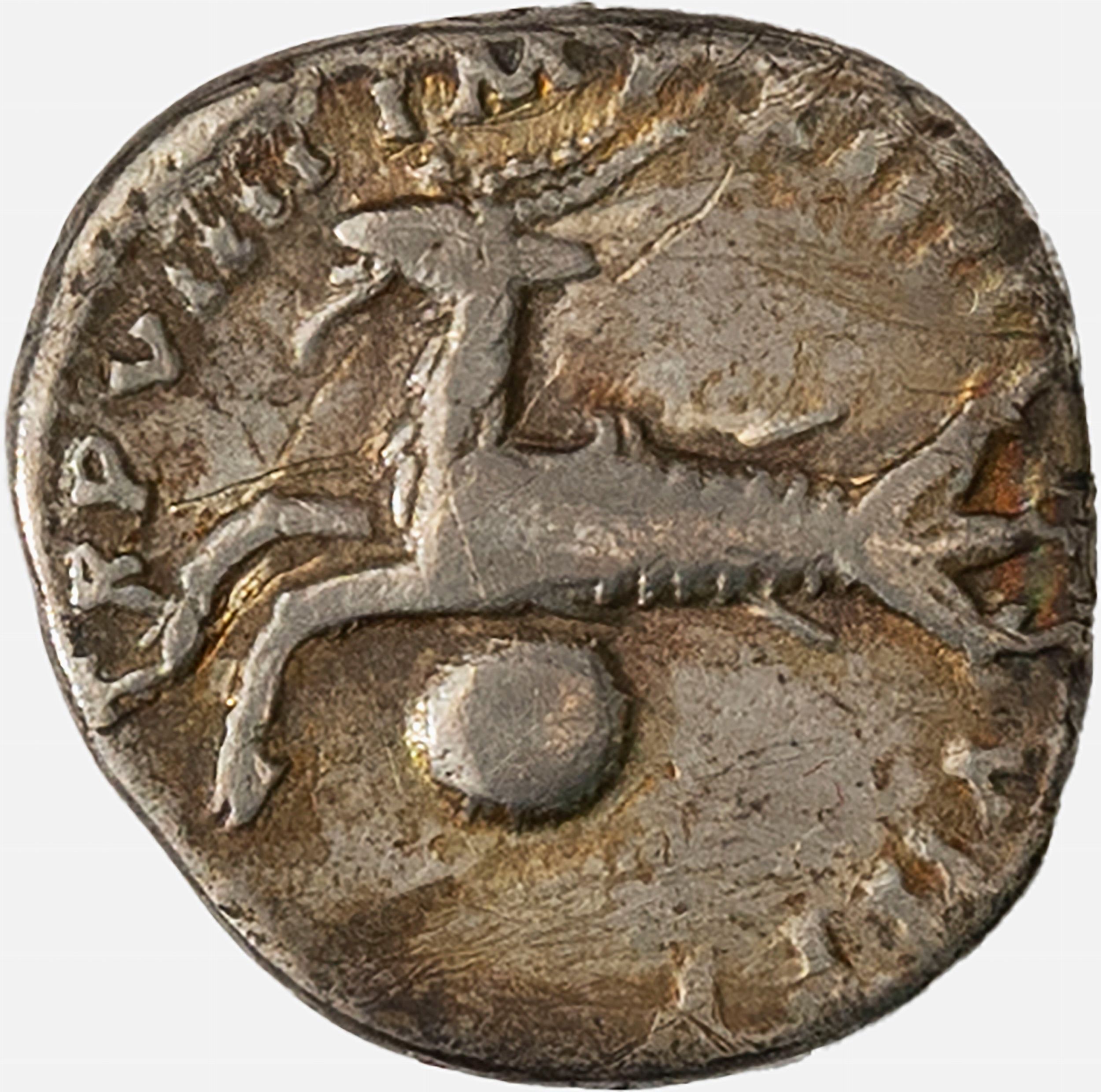 D/ testa laureata dell'Imperatore a d., R/ capricorno a s. sopra globo, Zecca di Roma, Rif. bibl. RIC II, 12, n. 19; Metallo: AR, gr. 3,04, diam. 17 mm., BB