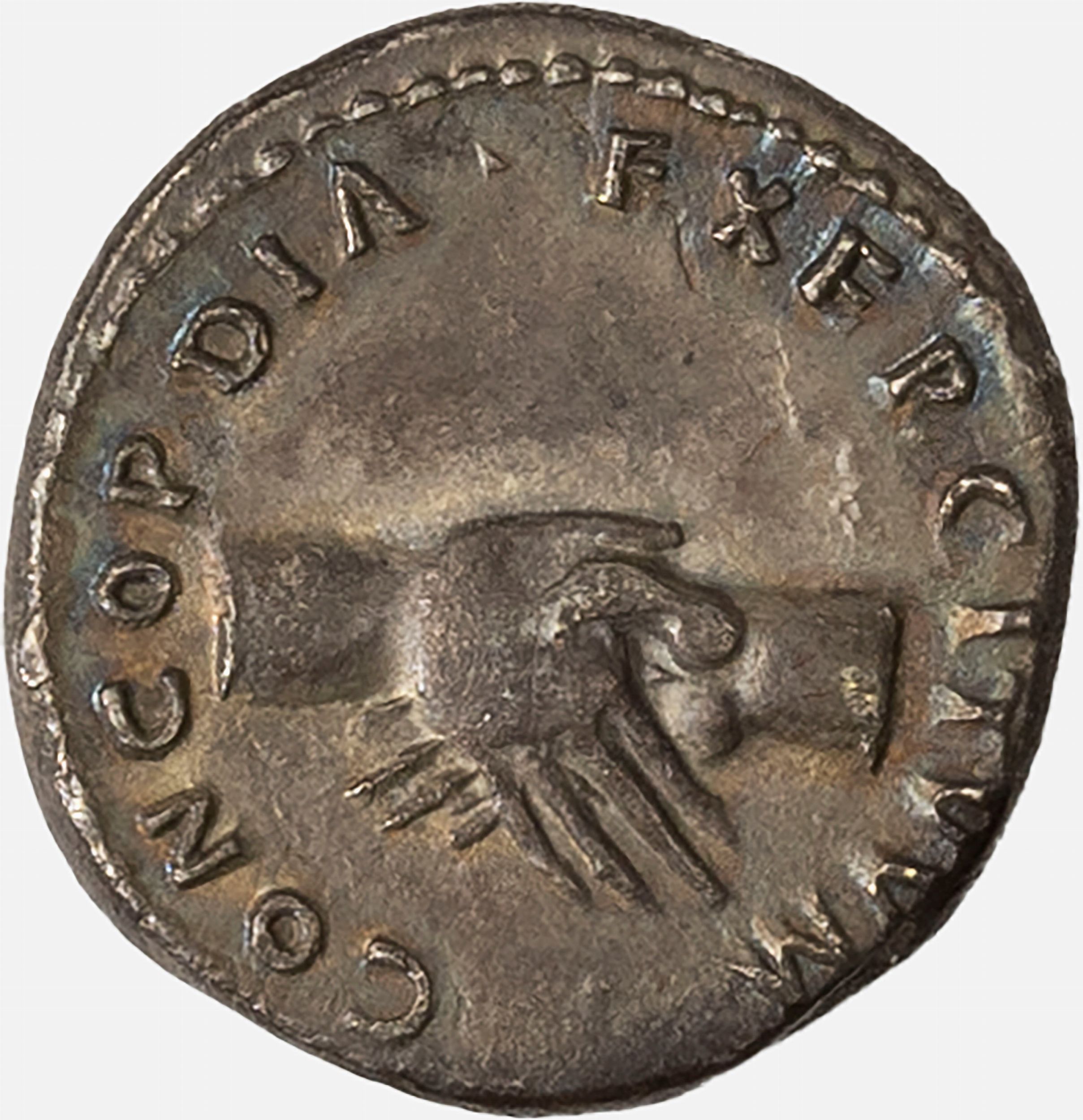 D/ testa laureata dell'Imperatore a d., R/ due mani congiunte, Zecca di Roma, Rif. bibl. RIC II Nerva 2 (denario); Metallo: AR, gr. 3,38, diam. 17 mm., mBB