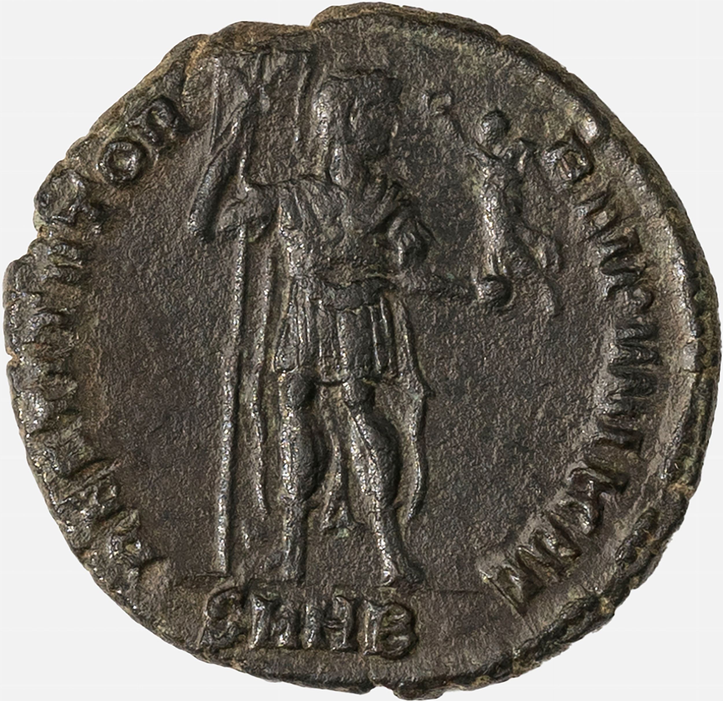 D/ busto diademato di perle, drappeggiato e corazzato dell'Imperatore a d., R/ l’Imperatore stante di fronte con la testa rivolta a d., tiene uno stendardo con la mano d. e un globo sormontato dalla Victoria con la s., Zecca di Heraclea, Rif. bibl. RIC IX Heraclea 11A; Metallo: AE, gr. 8,87, diam. 28 mm., mBB