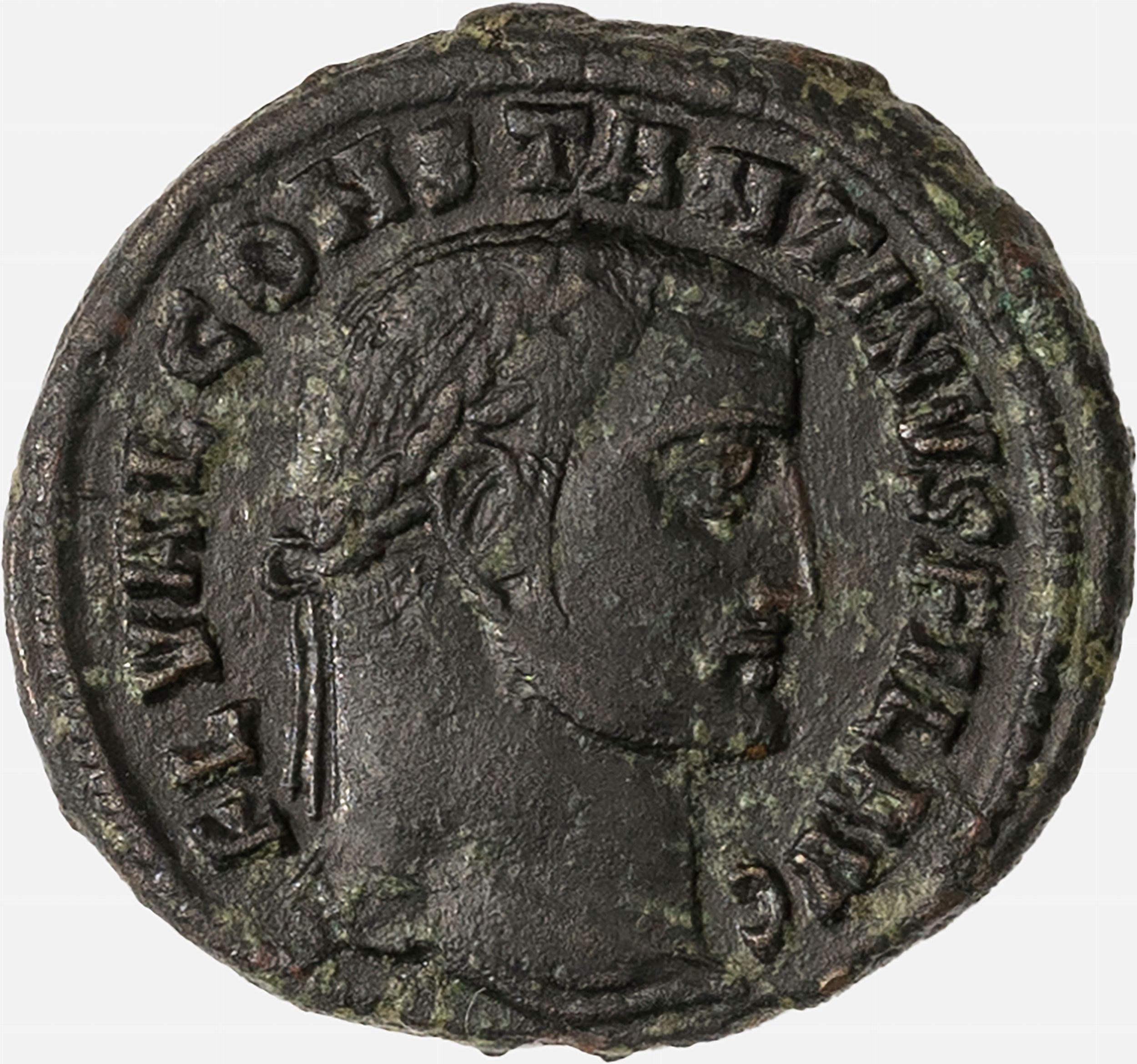 D/ busto laureato dell'Imperatore a d., R/ il Genio, nudo in piedi a s. con una clamide drappeggiata sulla spalla s., tiene una patera nella mano d. e una cornucopia nella mano s., Zecca di Alessandria; Metallo: AE, gr. 6,65, diam. 24 mm., mBB