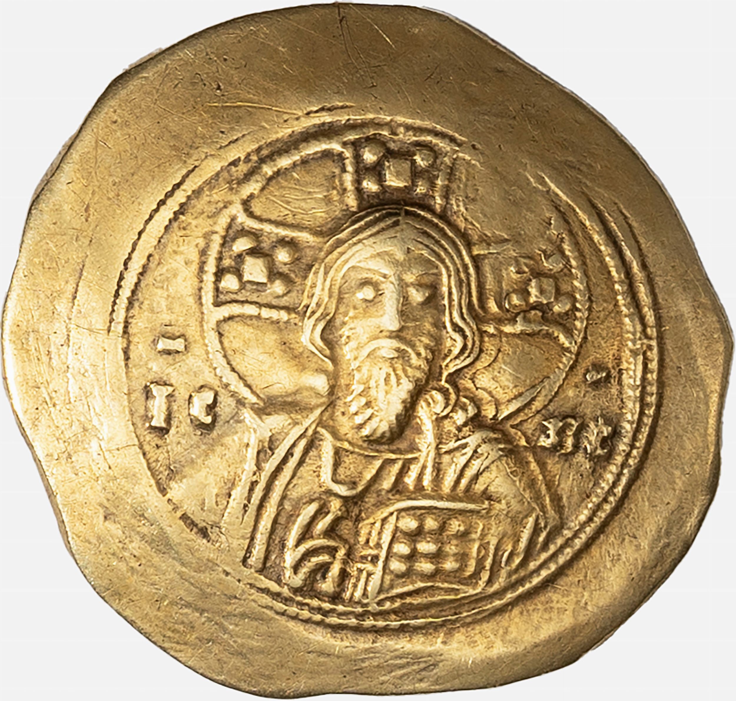 D/ busto nimbato del Cristo Pantocrator nell'atto di benedire, R/ busto dell'Imperatore di fronte con labarum nella mano d. e un globo crucigero nella s., Zecca di Costantinopoli; Metallo: AV, gr. 4,46, diam. 26,52 mm., MB