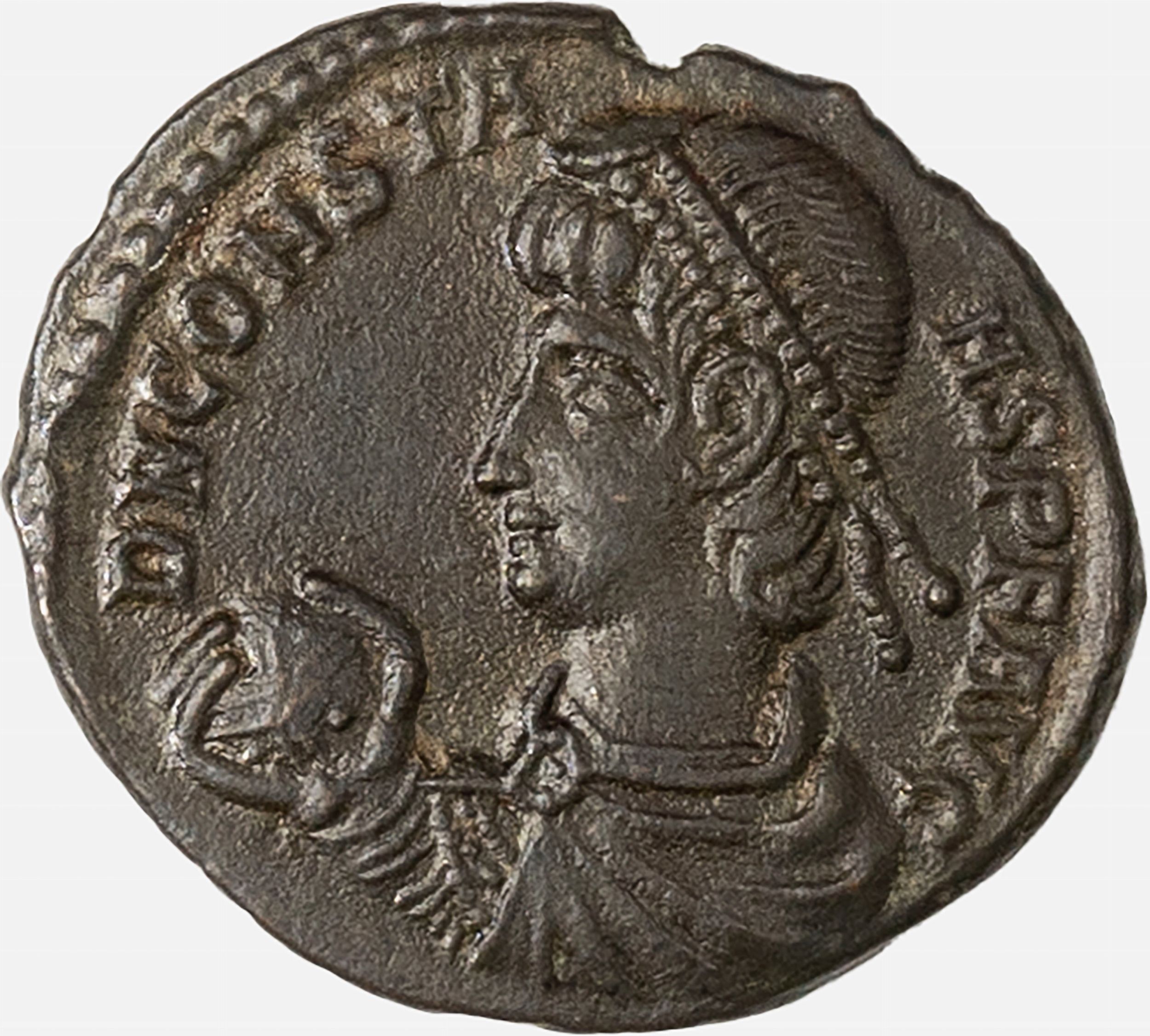 D/ busto diademato di perle, drappeggiato e corazzato dell'Imperatore a s., con in mano un globo R/ soldato che avanza a d. con la testa rivolta a s., con in mano una lancia, mentre conduce una piccola figura da una capanna sotto un albero, Rif. bibl. RIC VIII 86; Metallo: AE, gr. 3,61, diam. 21 mm., mBB