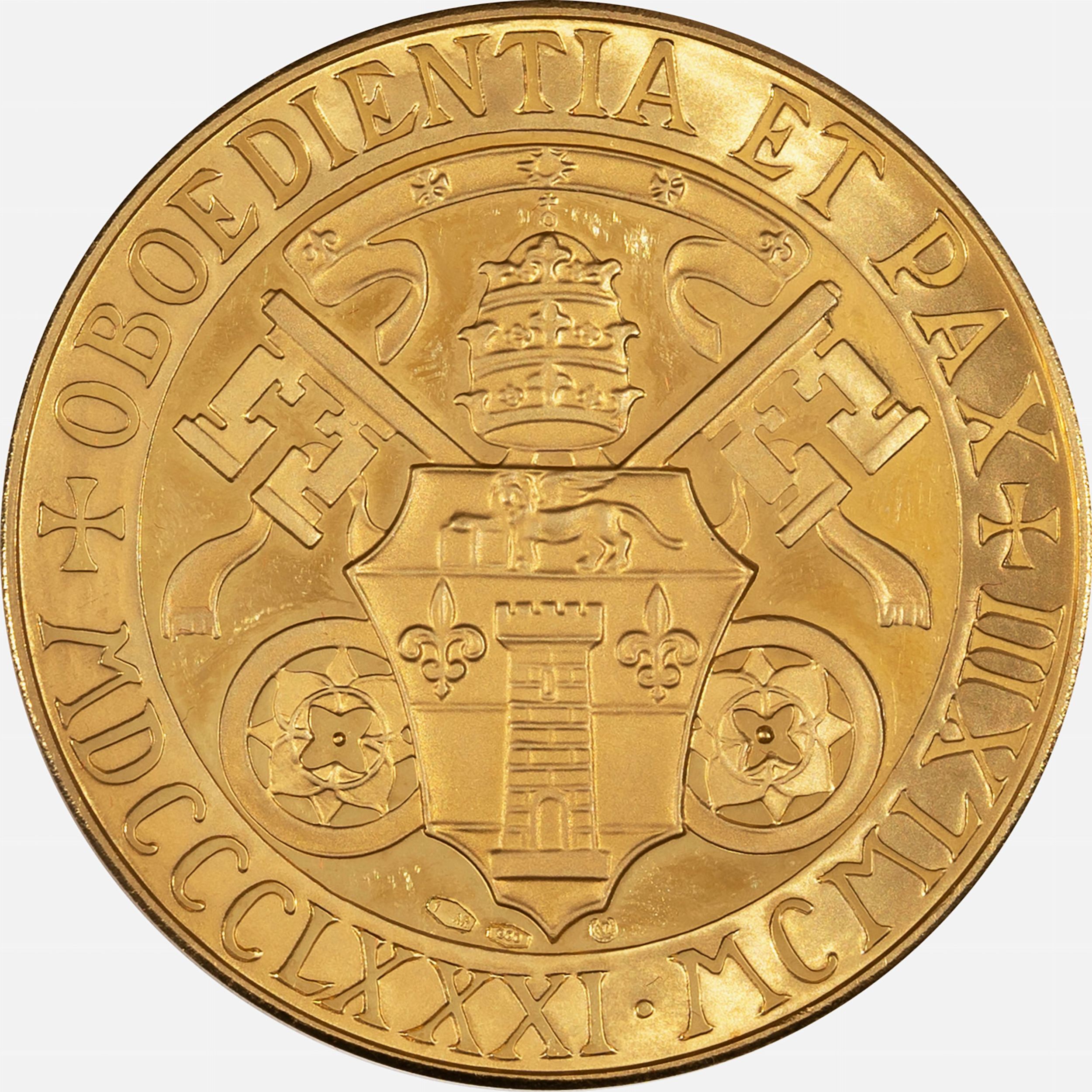 1963 D/ busto del Papa a s. JOANNES XXIII PONTIFEX MAXIMUS R/ stemma sovrapposto alle chiavi decussate e sormontato dalla tiara OBOEDIENTIA ET PAX MDCCCLXXXI MCMLXIII; Metallo: AV, gr. 34,99, Diam: mm. 44,65. SPL