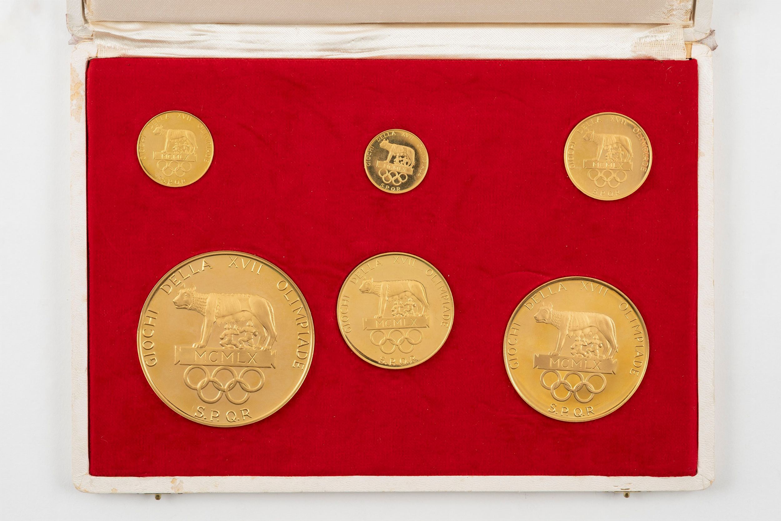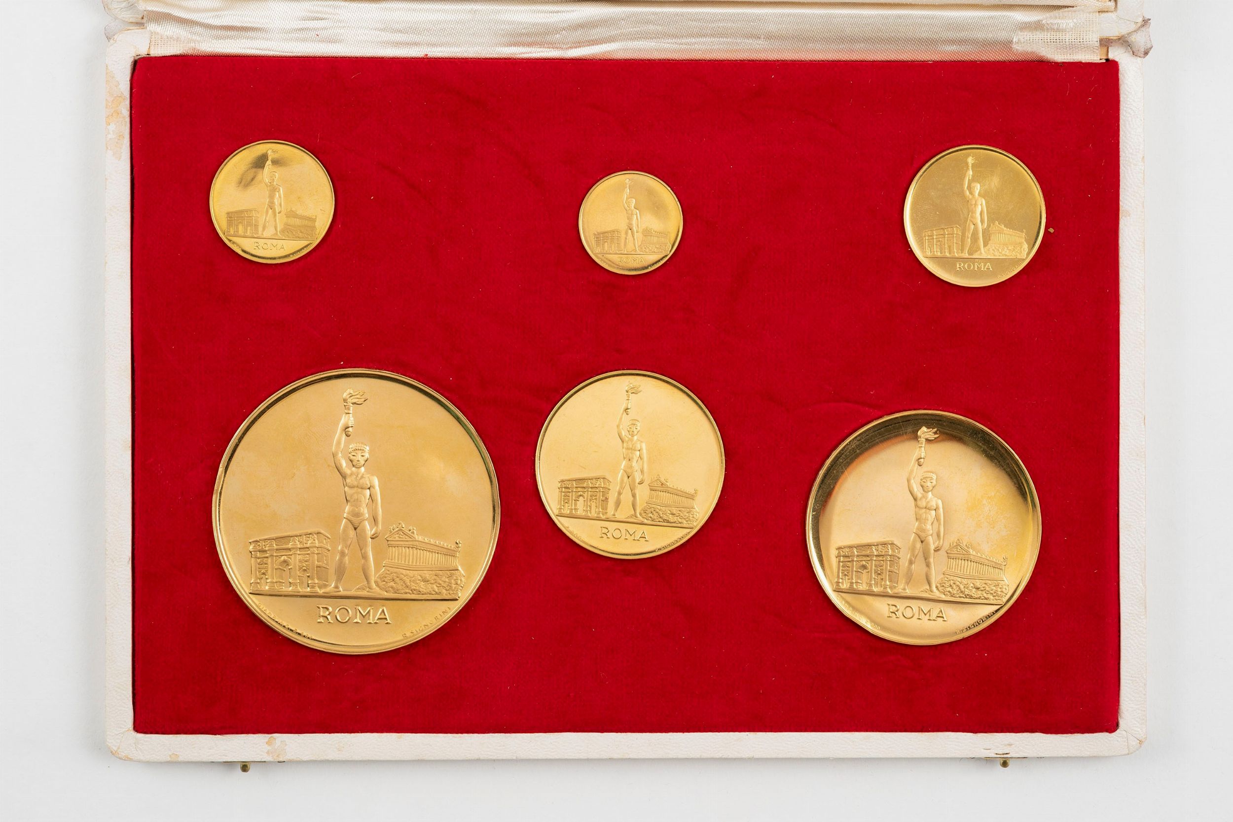 1960 D/ il tedoforo in piedi di fronte mentre solleva la torcia olimpica, tra l'Arco di trionfo di Costantino e il Partenone di Atene R/ la Lupa capitolina su cartella iscritta: MCMLX e i cinque cerchi olimpici, Zecca di Roma; Metallo: AV, rispettivamente gr. 105, Diam: mm. 60; gr. 70, Diam: mm. 50; gr. 35, Diam: mm. 40; gr. 17,5, Diam: mm. 30; gr. 10,5, Diam: mm. 26; gr. 7, Diam: mm. 22 (peso totale gr. 245). SPL