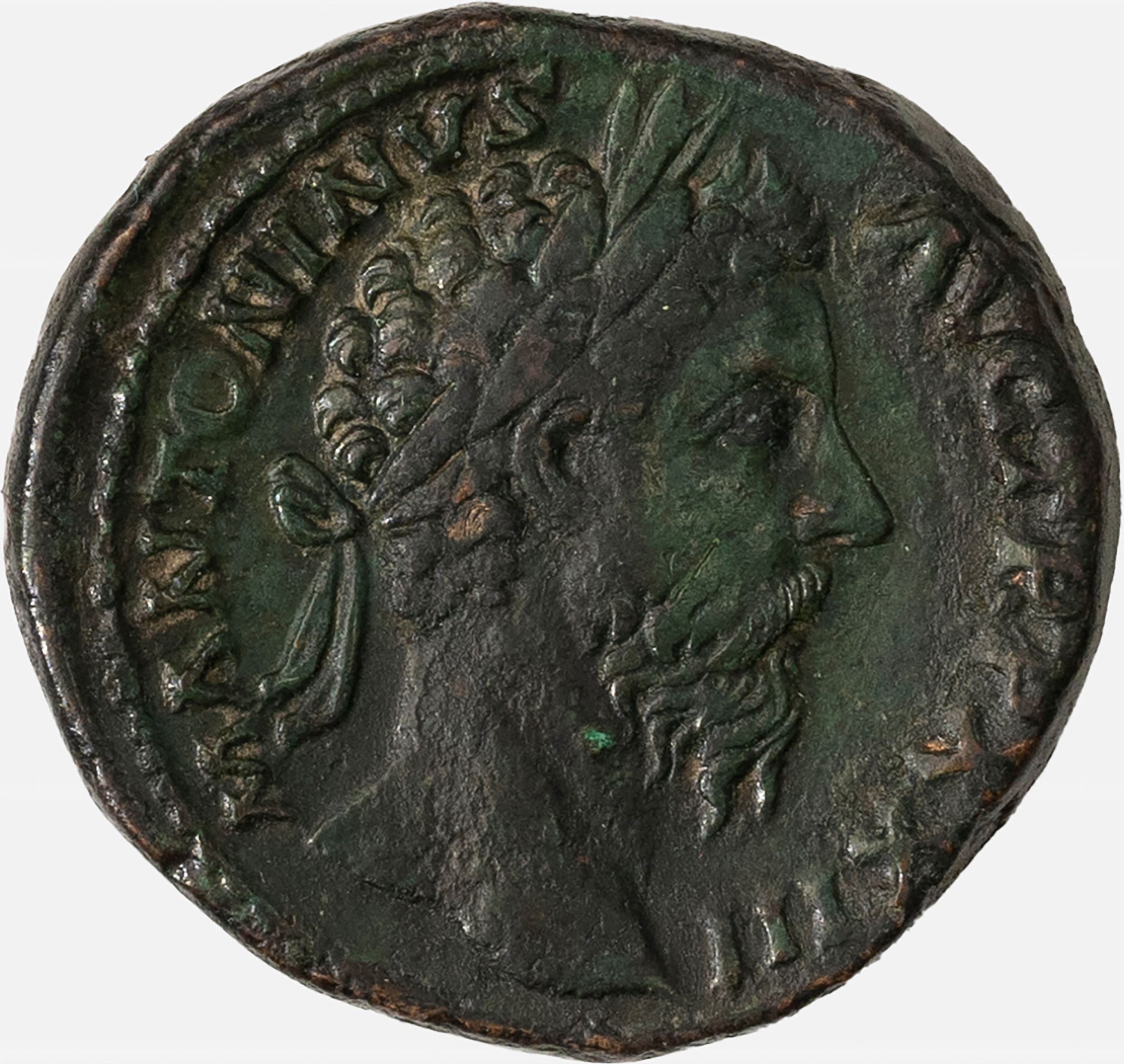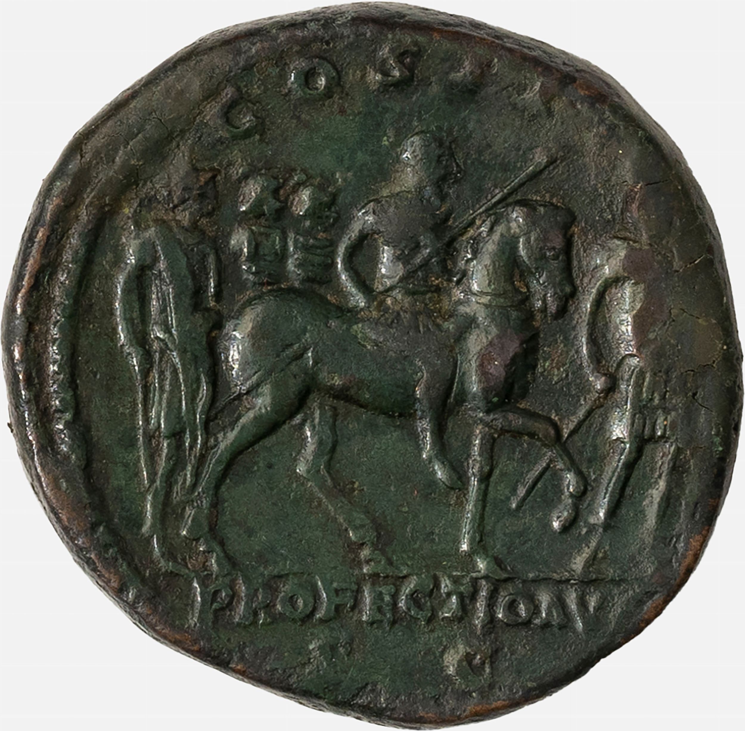 D/ testa barbuta e laureata dell'Imperatore a d., R/ L’Imperatore in abito militare al trotto verso d., tiene una lancia con la mano d.; dinnanzi a lui un soldato armato e dietro altri tre, uno dei quali con la lancia, Zecca di Roma, Rif. bibl. RIC III Marco Aurelio 963; Metallo: AE, gr. 25,20, diam. 31 mm., mBB