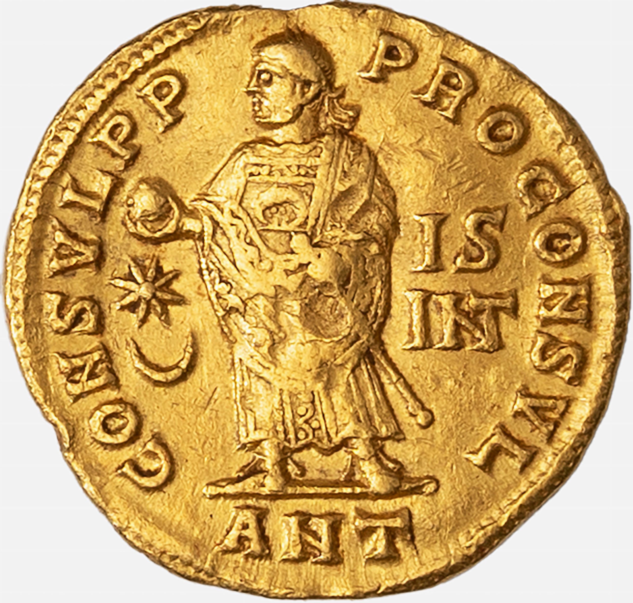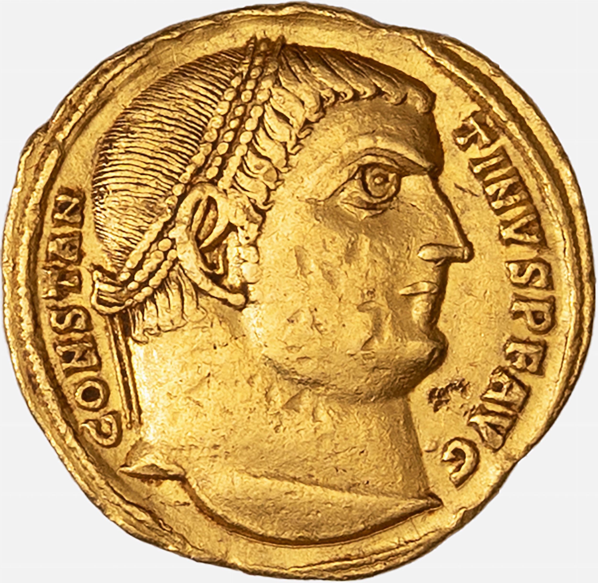 D/ CONSTANTINVS P F AVG, Testa diademata a d., R/ CONSVL P P PROCONSVL, IS NT, ANT, Zecca di Antiochia, Rif. bibl. RIC 22; Metallo: AV, gr. 5,28, Diam.: mm. 20,10, mBB.