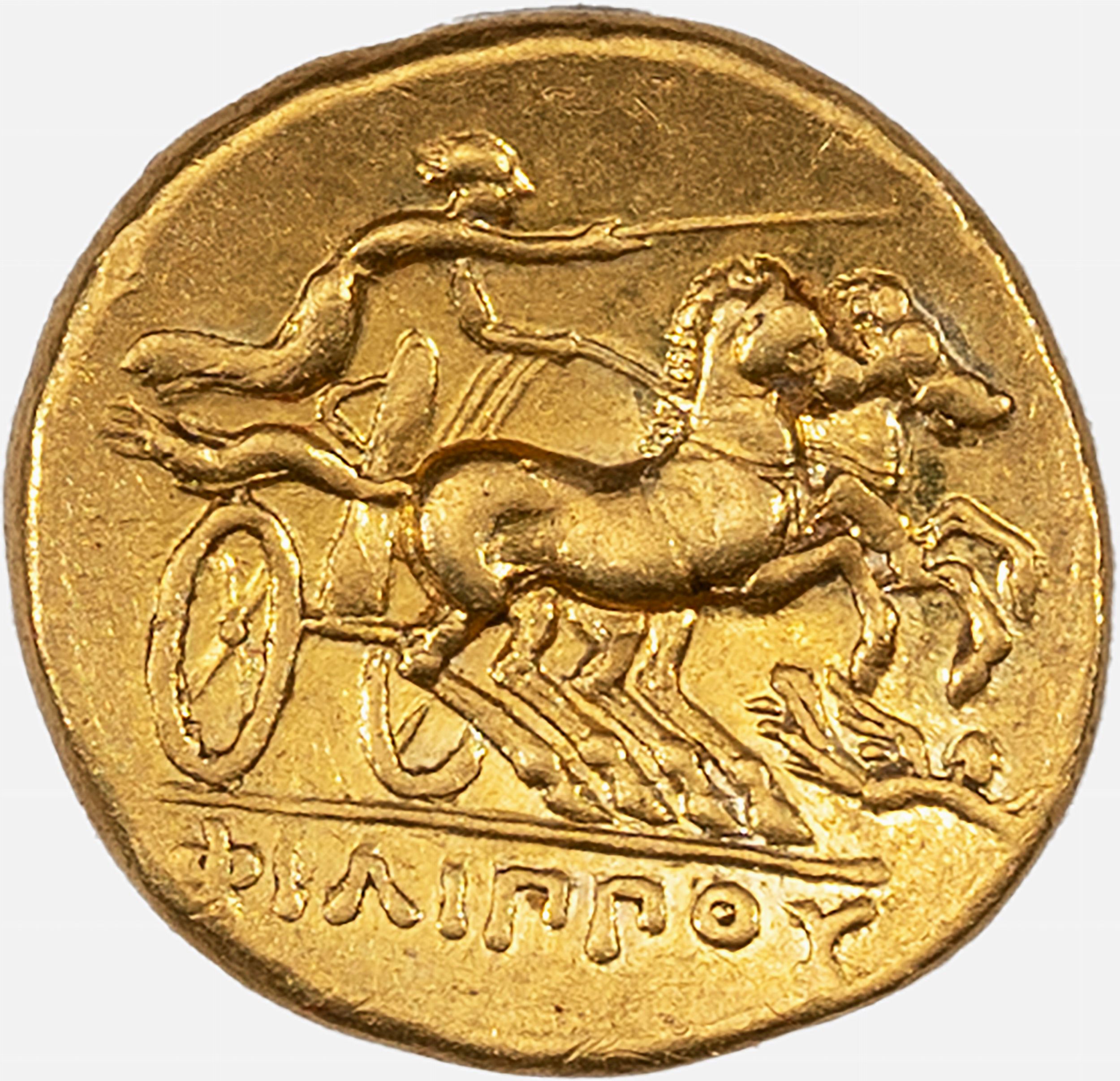 D/ testa laureata di Apollo a d., R/ auriga su biga a d., tiene il frustino con la destra e le redini con la sinistra. Sotto le zampe dei cavalli una Nike in volo a d. con corona, Zecca di Pella, Rif. bibl. Le Rider 357; Metallo: AV, gr. 8,56, diam. 18,52 mm., qSPL
