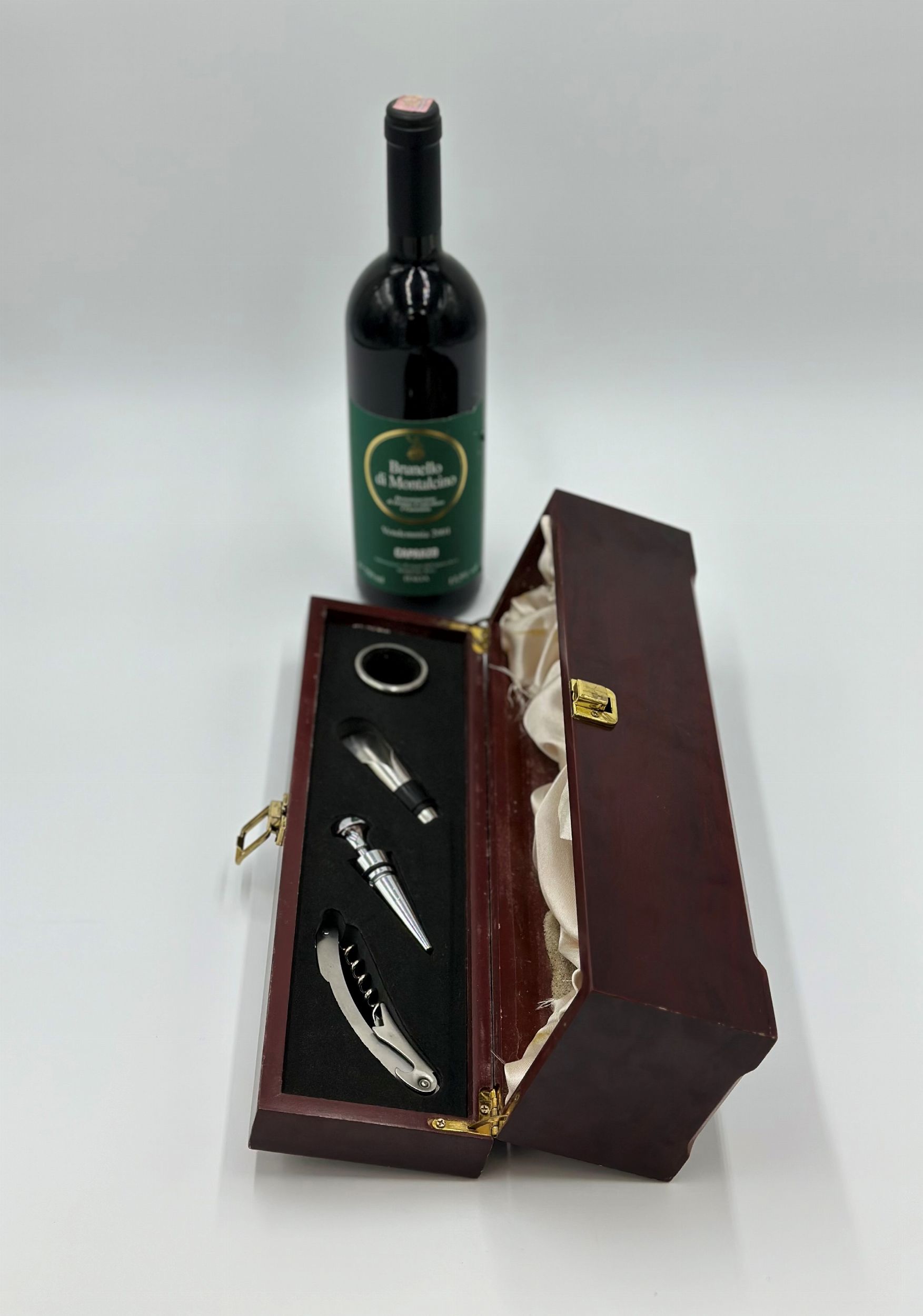 Confezione: scatola in legno di rovere originale con kit di apertura bottiglie.
