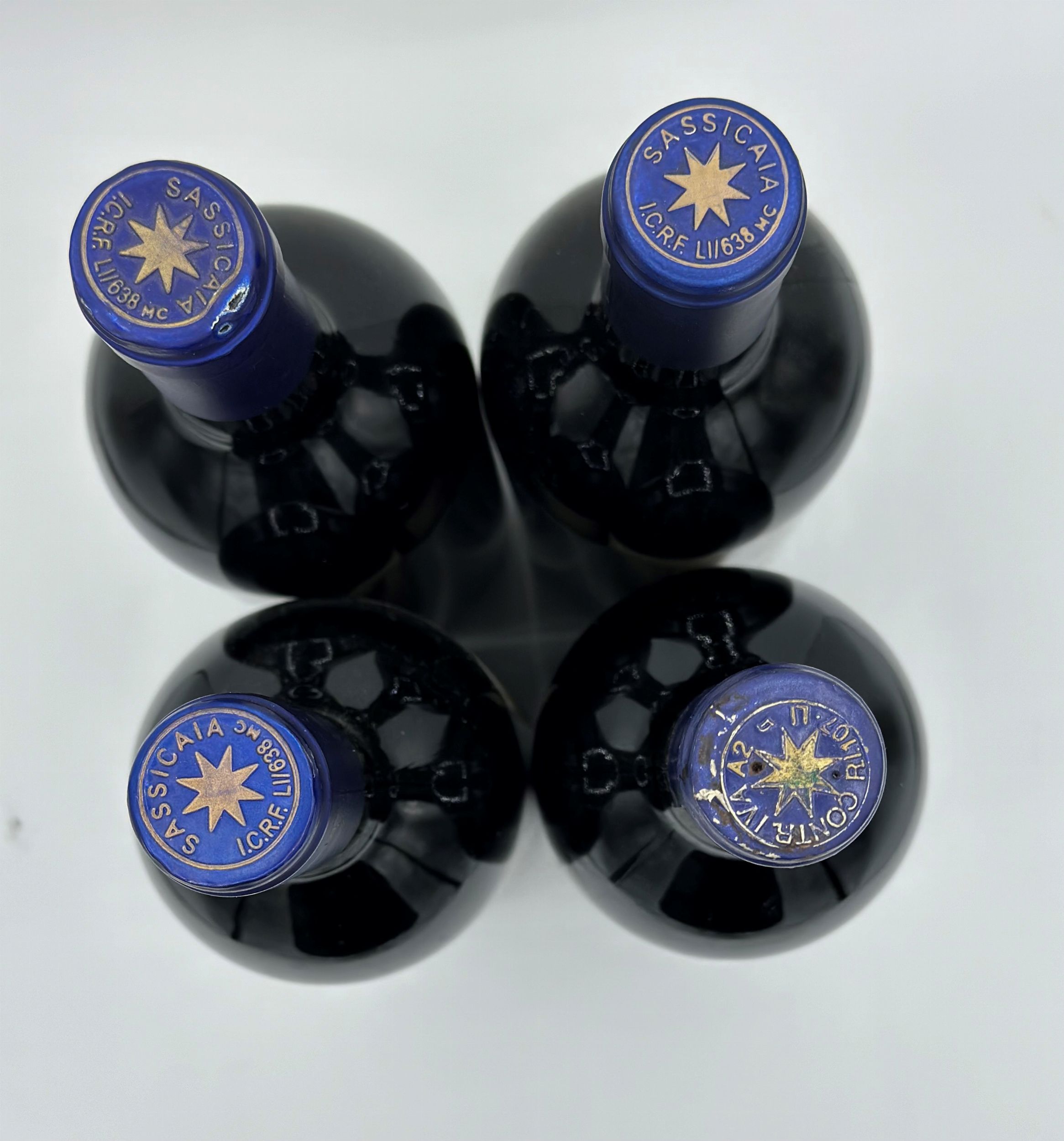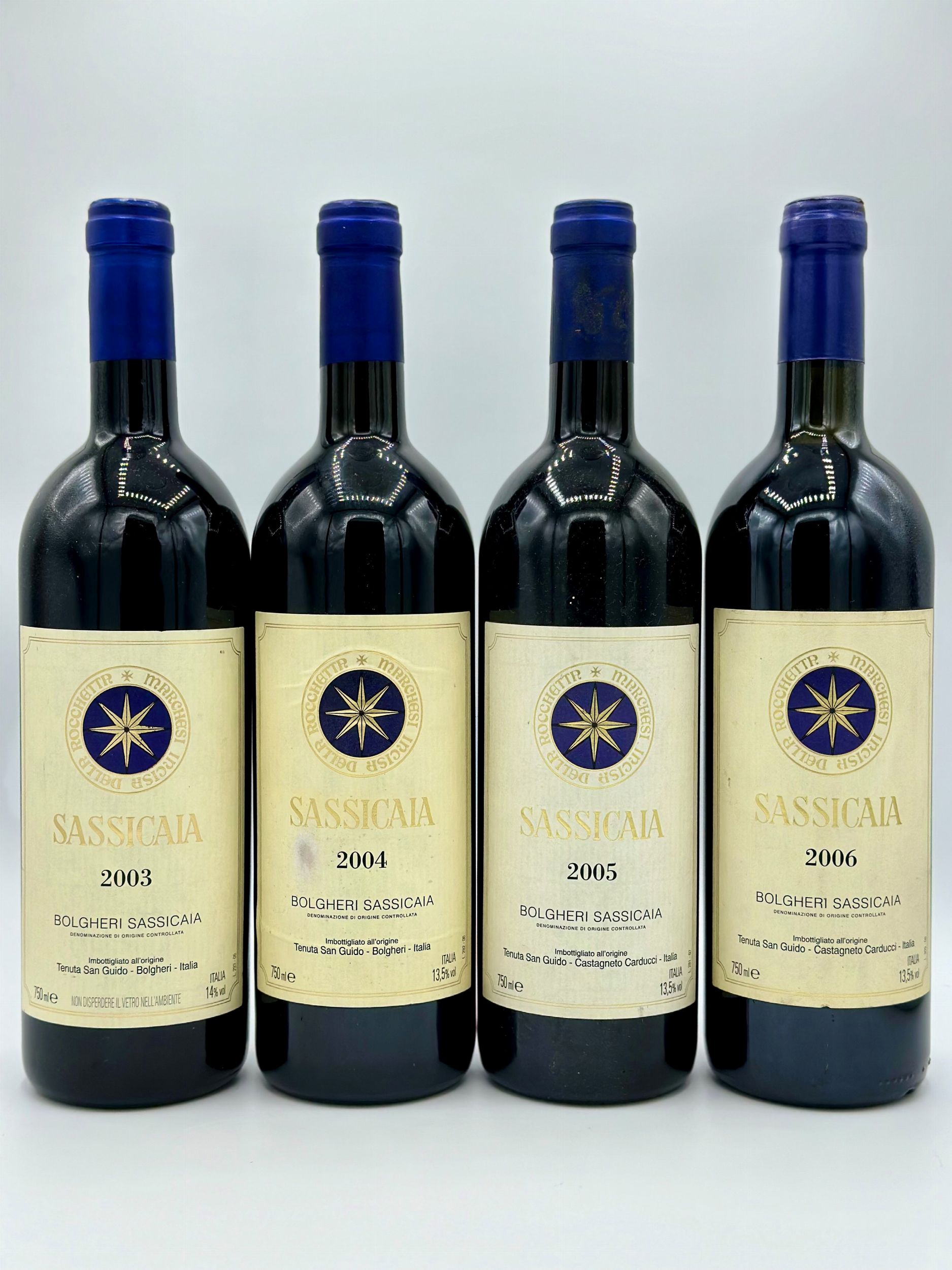 2003-2004-2005-2006 Toscana, Sassicaia DOC - 4 bottiglie (bt), annata verticale 2003, 2004, 2005 e 2006.Livello: collo inferiore (BN).Condition report: etichetta e capsula in buone condizioni.