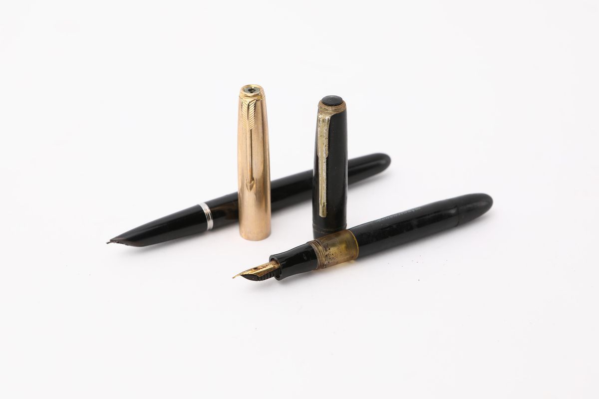 Lotto di 2 penne stilografiche: Parker 51 - con cappuccio laminato in oro 12 kt; [..]