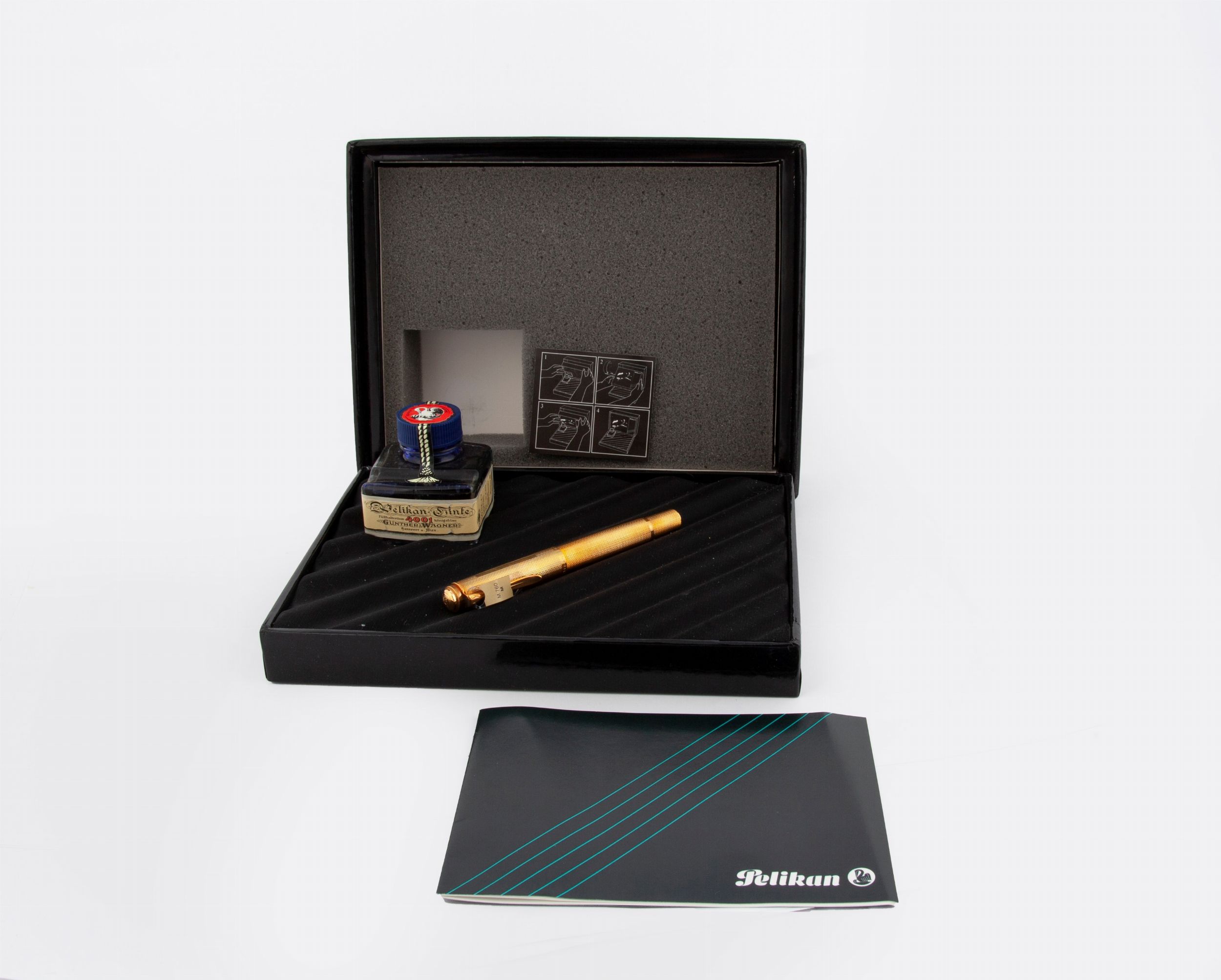 Pennino M in oro giallo 14kt. Entro astuccio con scatola, garanzia, istruzioni e boccetta d'inchiostro. Nr. di serie 027127. Nuova.