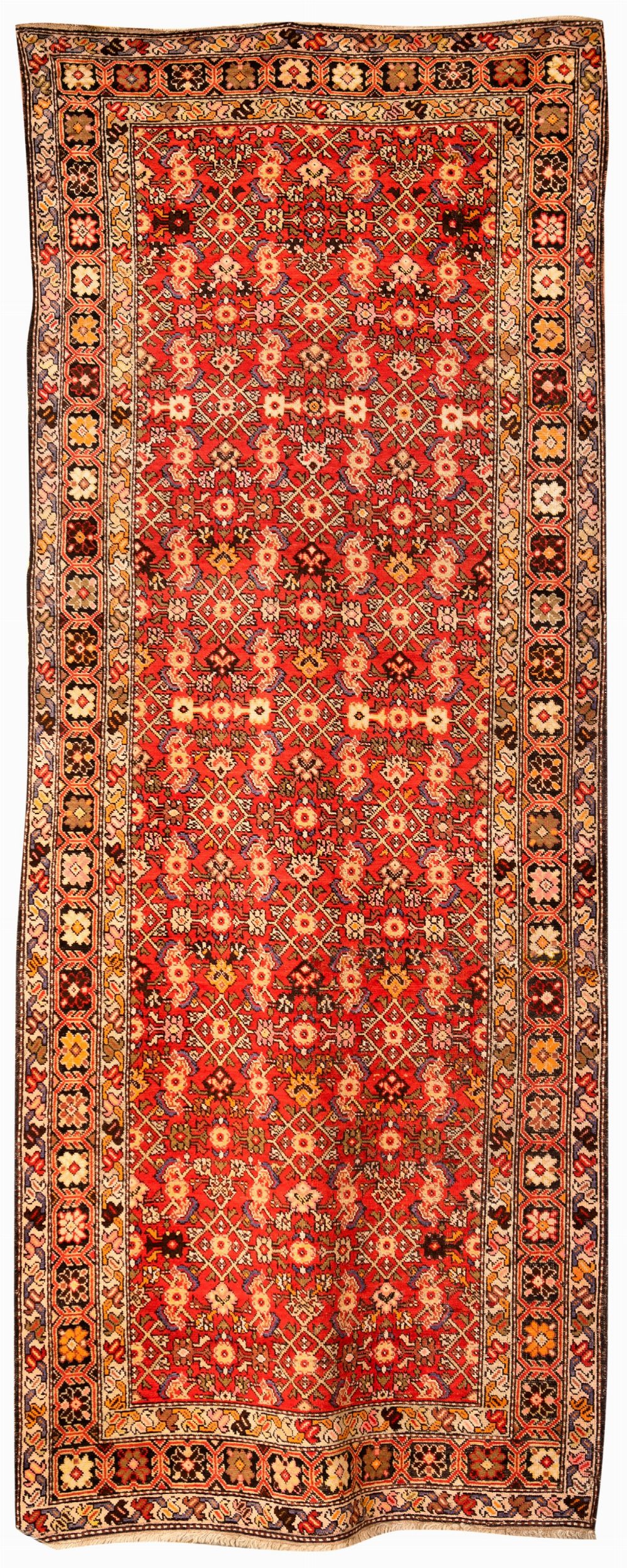 fitta decorazione a motivi a motivi geometrici e floreali nei toni del bianco e del marrone entro triplice bordura