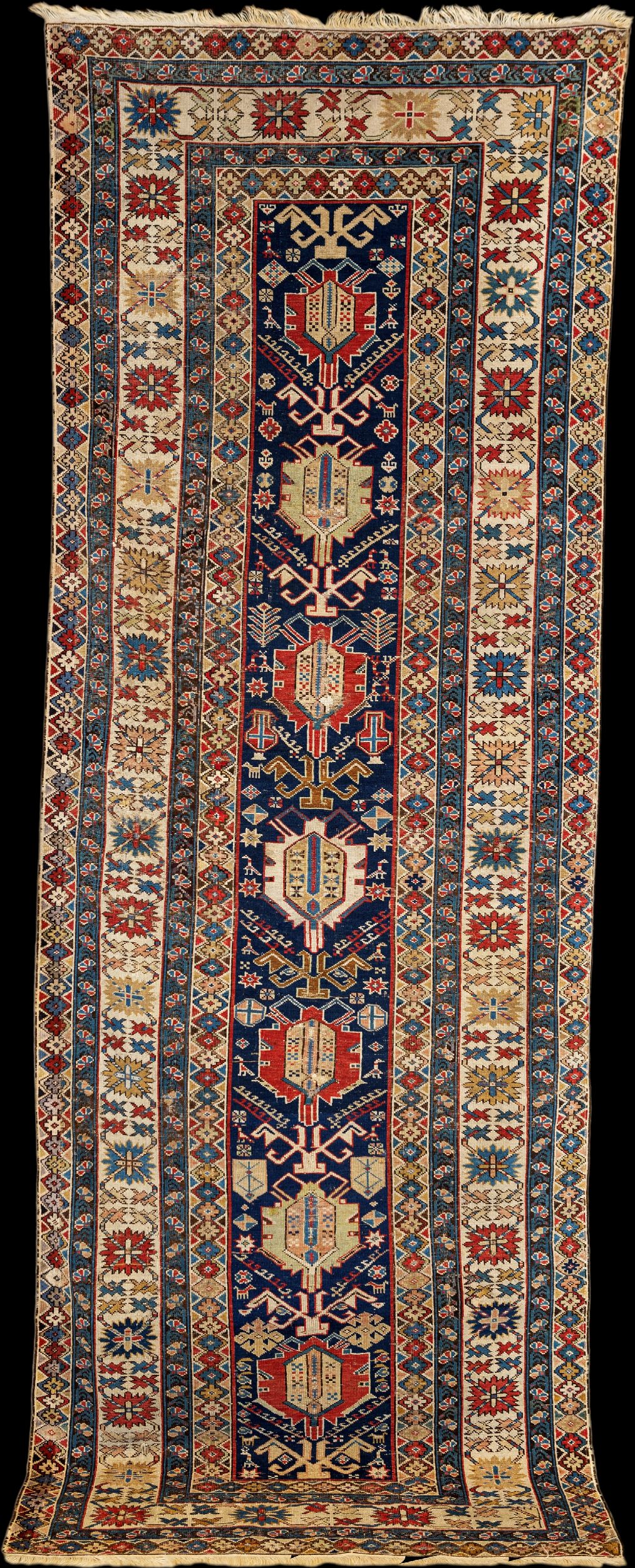 disegno geometrico e a motivi stilizzati nei toni dominanti del rosso, azzurro e bianco entro molteplici piccole bordure