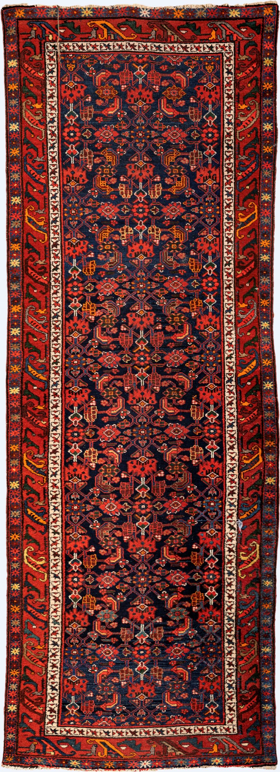 fitto disegno a motivi geometrici e floreali nei toni dominanti del rosso, entro molteplici bordure
