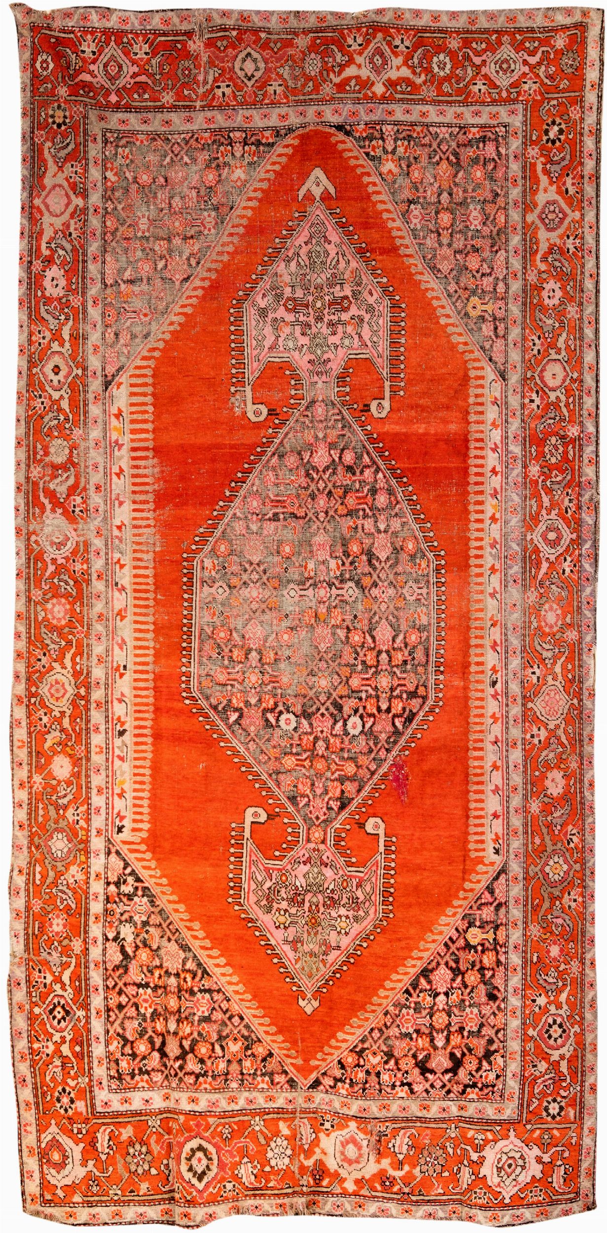 cm 384x188 medaglione esagonale cuspidato con fitta decorazione a motivi stilizzati, ripetuta su quattro cantonali fondo bruno; cornice principale rossa delimitata da piccole bordure bianche. Segni di usura e strappi