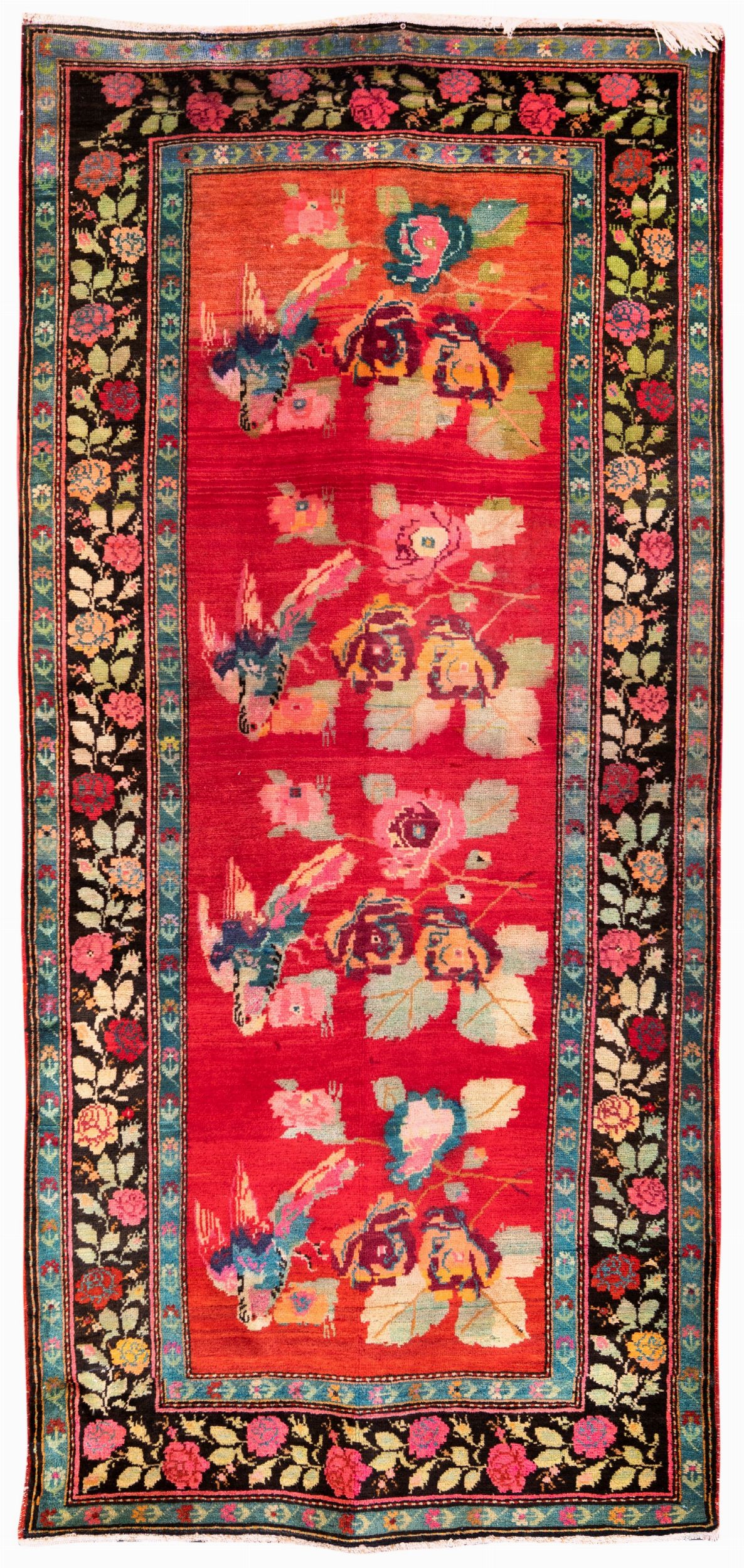 disegno a grandi fiori e pappagalli; cornice principale nera con rose, delimitata da piccole bordure azzurre. Consunto