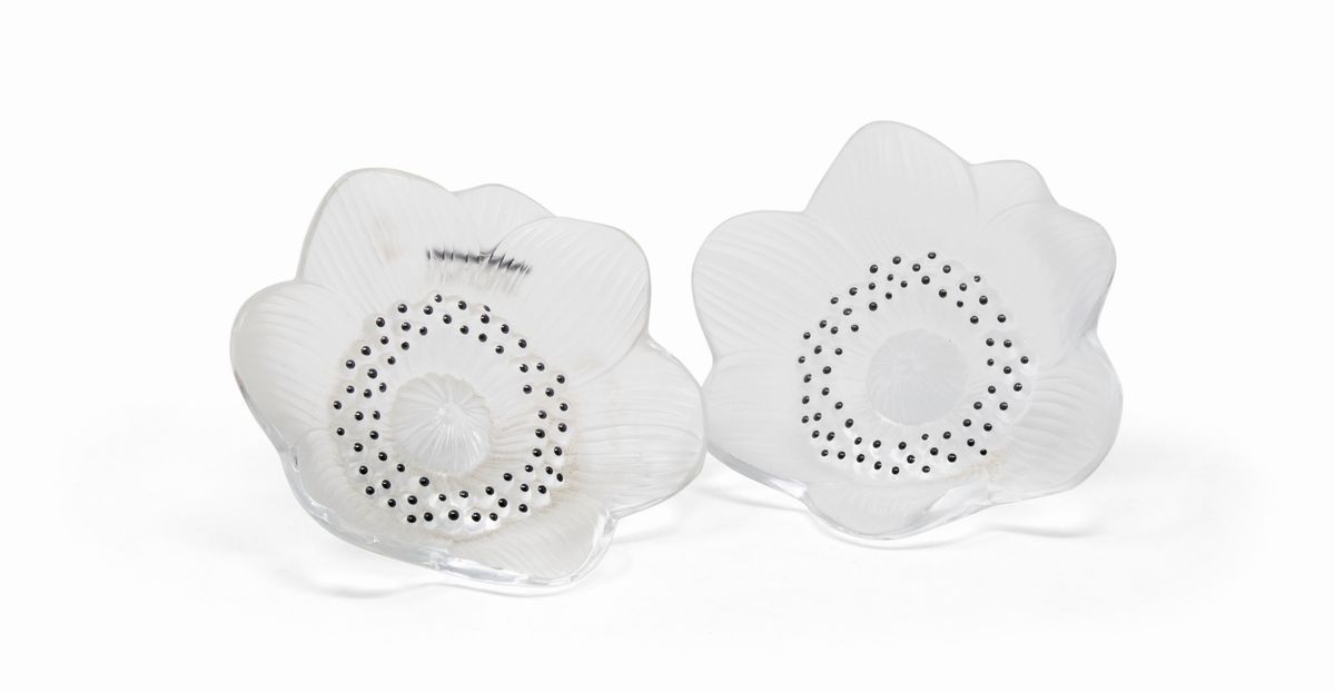 Lalique coppia di Anémone ouverte in vetro pressato incolore, satinato e smaltat [..]