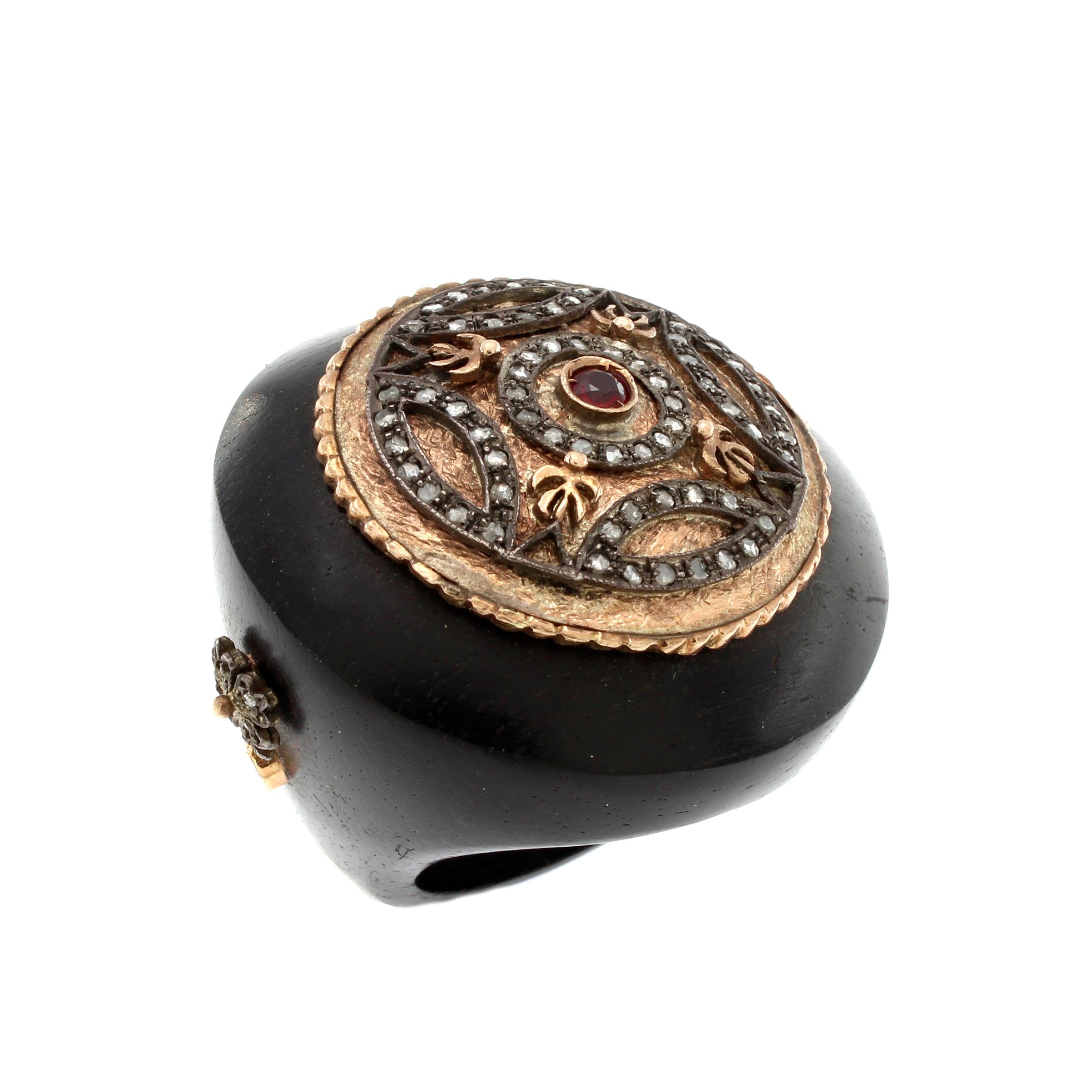 Anello in ebano oro rosa 14kt con rubino, rose di diamante e zaffiri