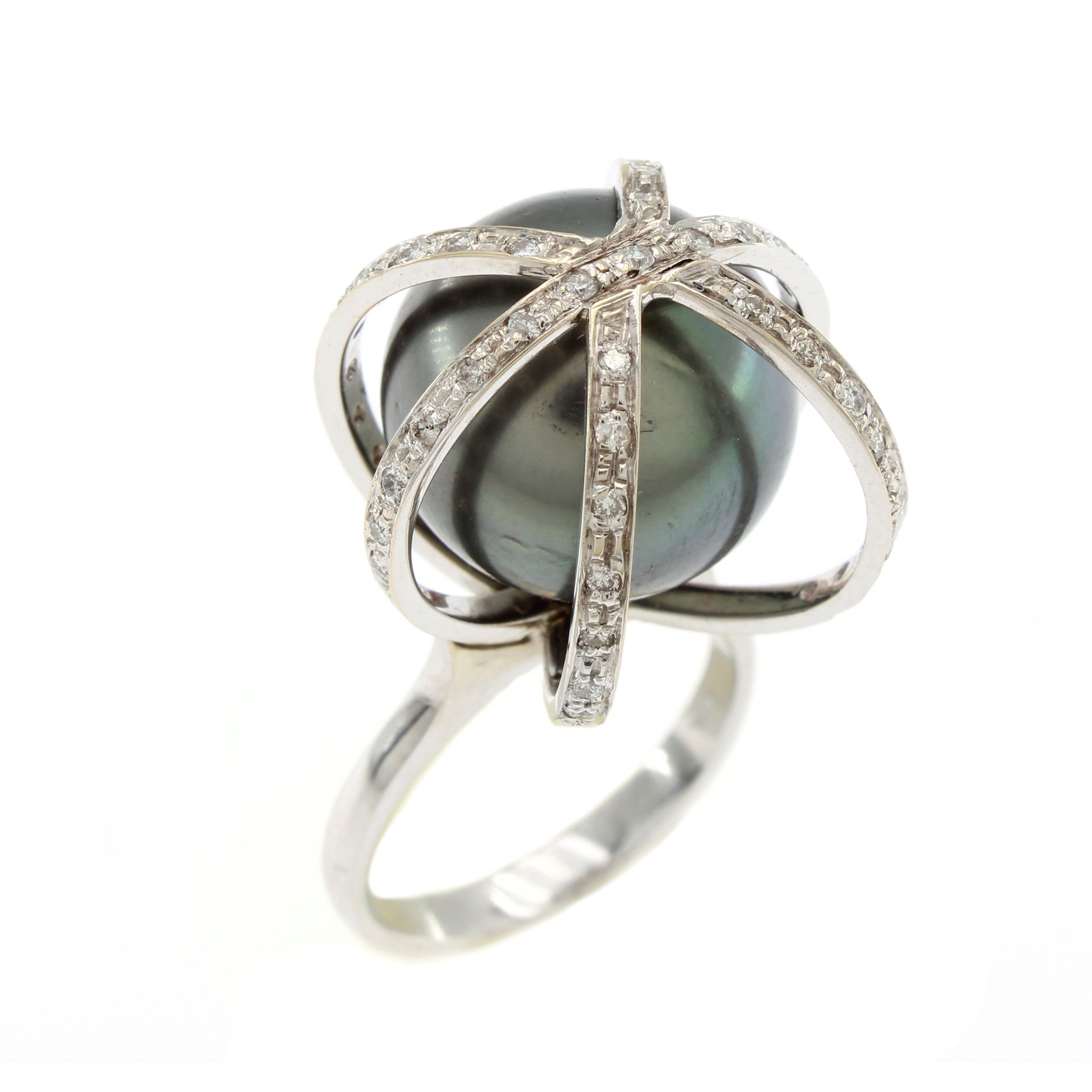 Anello in oro bianco 18kt e diamanti e perla Thaiti mobile