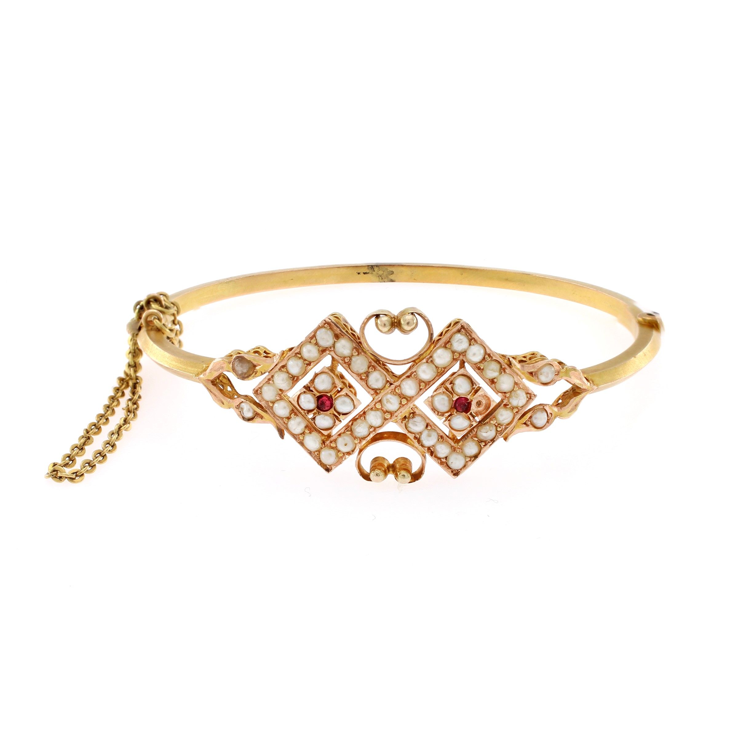 Antico bracciale a manetta in oro giallo 9kt perline e due granati