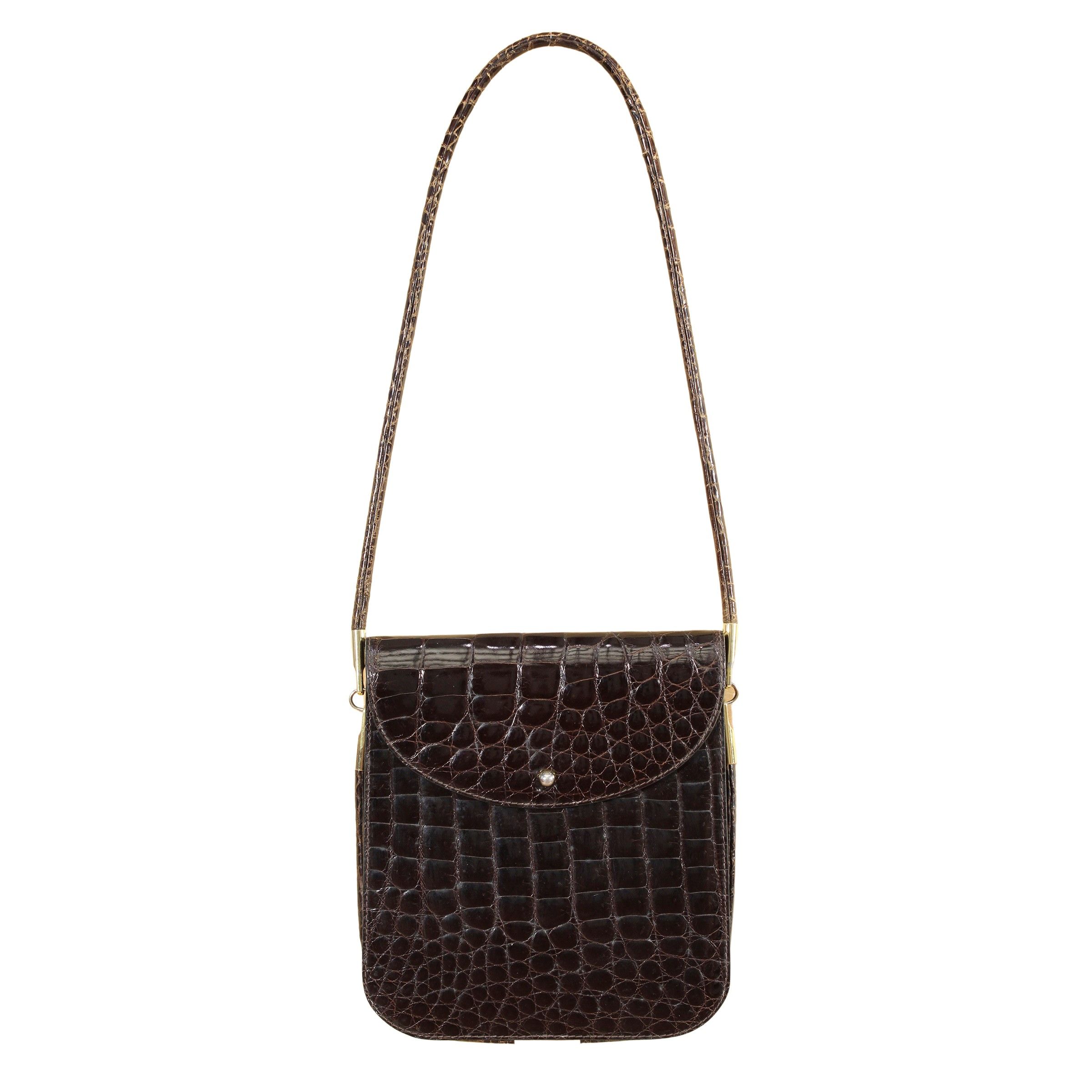 in pelle marrone scuro, finiture dorate, interno ad uno scomparto con tasca a zip, chiusura a scatto, tracolla a spalla