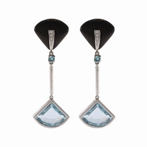 peso 5 gr. alternati da diamanti taglio huit.-huit e sormontati da due acquamarine taglio ovale, lunghezza 3,7 [..]