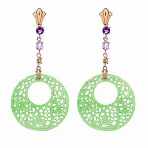 Orecchini pendenti in oro 9kt, argento e giada verde incisa