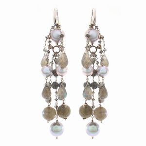 Orecchini pendenti in oro bianco 18kt, perle grigie e labradorite sfaccettata