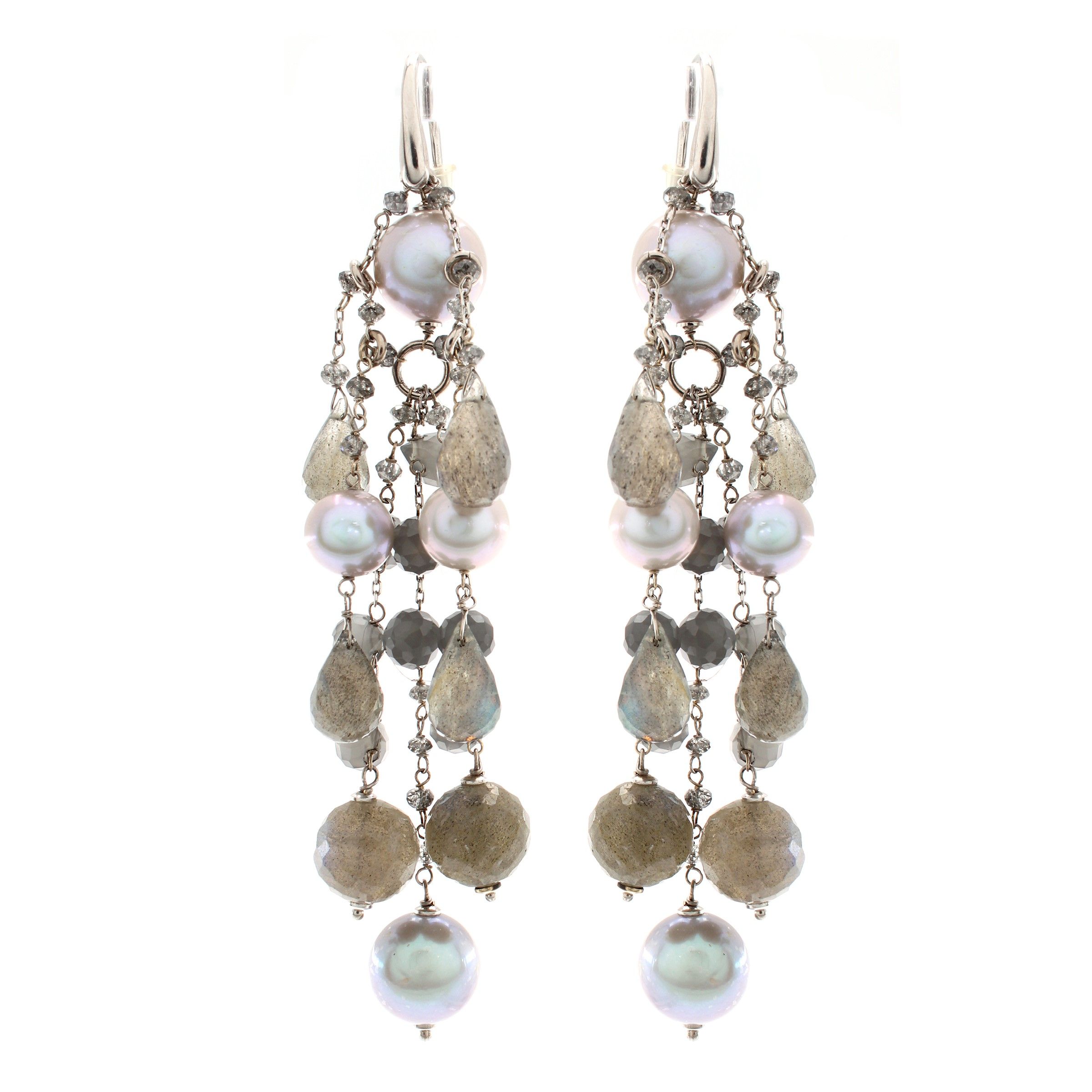 Orecchini pendenti in oro bianco 18kt, perle grigie e labradorite sfaccettata