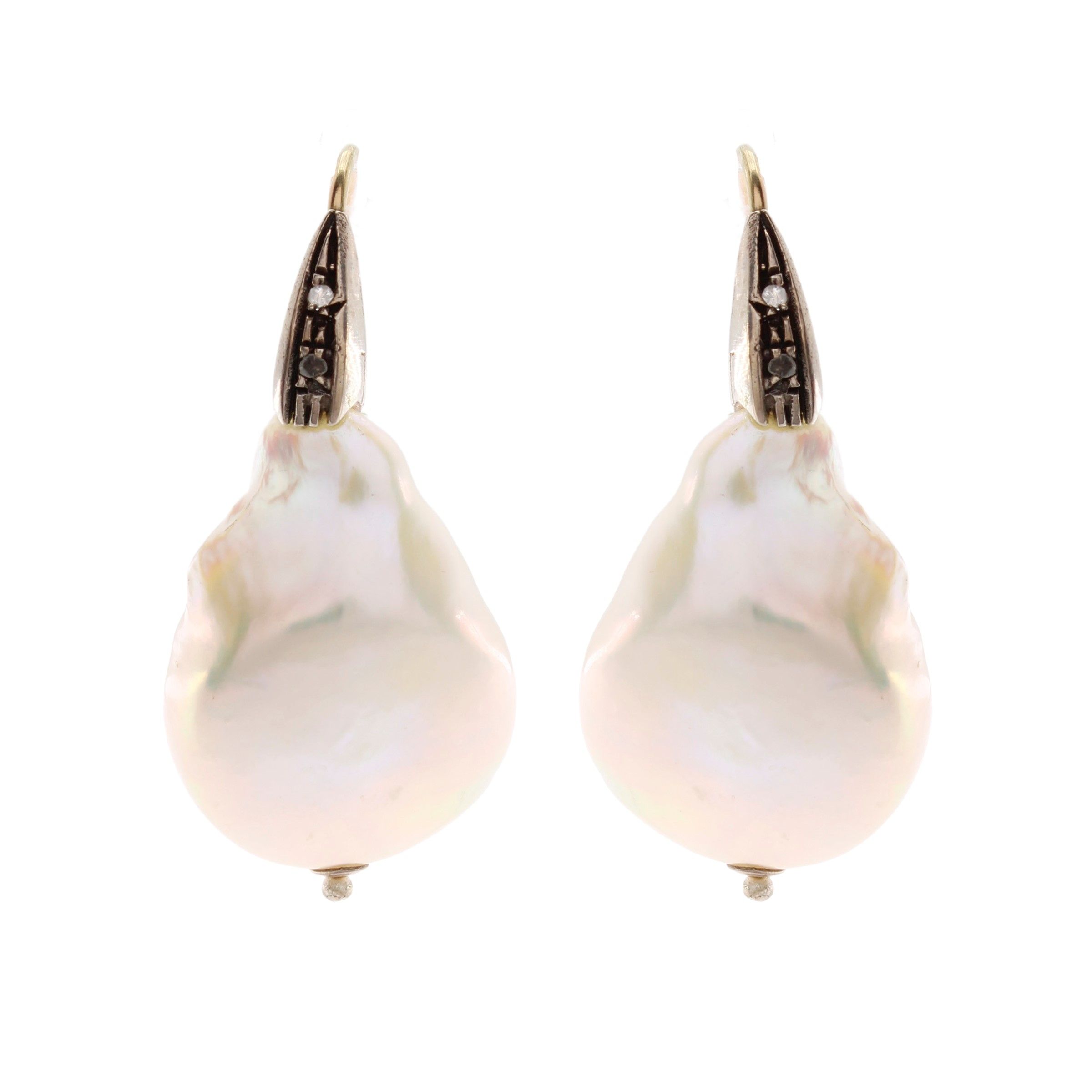 Orecchini pendenti in oro giallo 9kt, argento, madreperla e rose di diamante