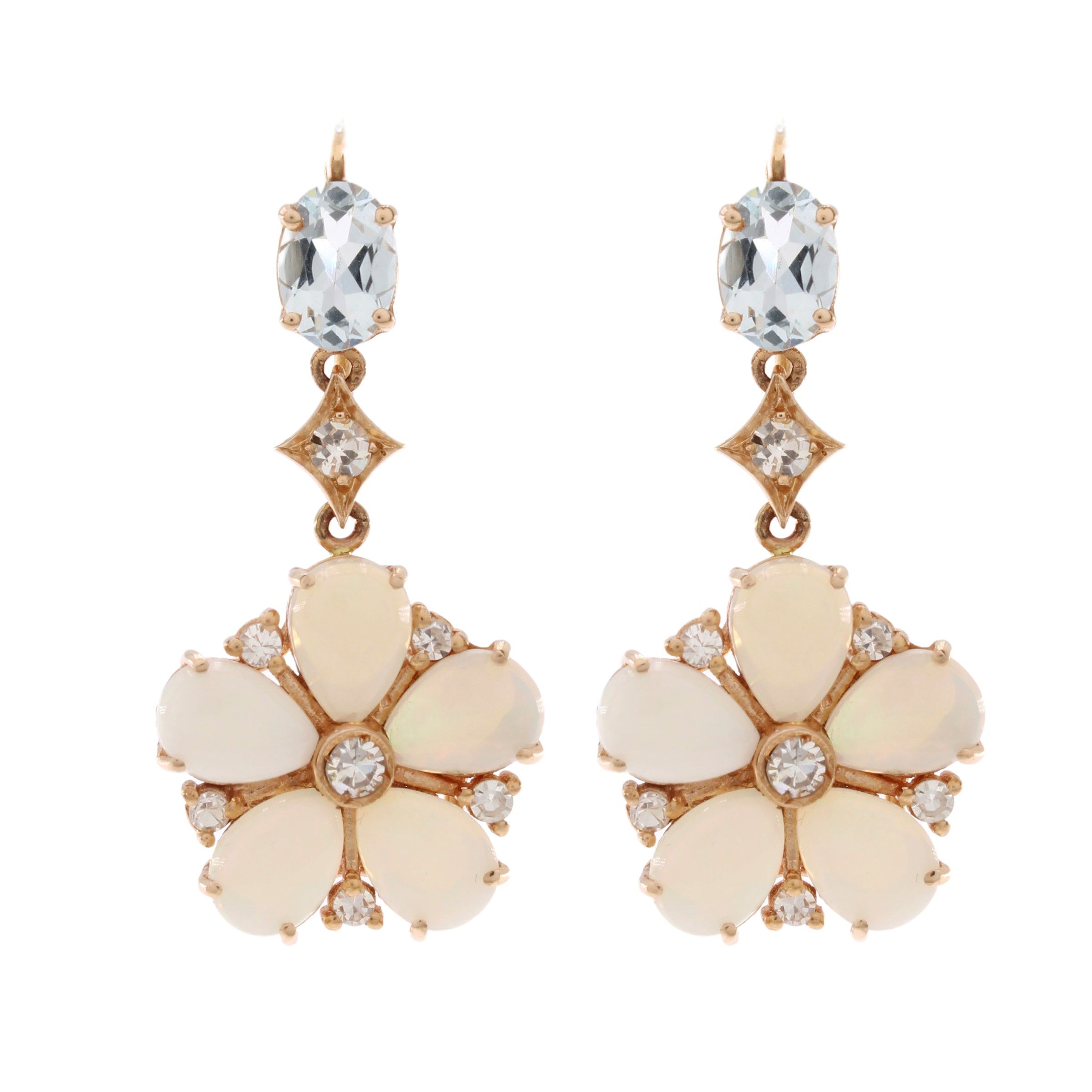 alternati da diamanti taglio huit.-huit e sormontati da due acquamarine taglio ovale, lunghezza 3,7 cm.