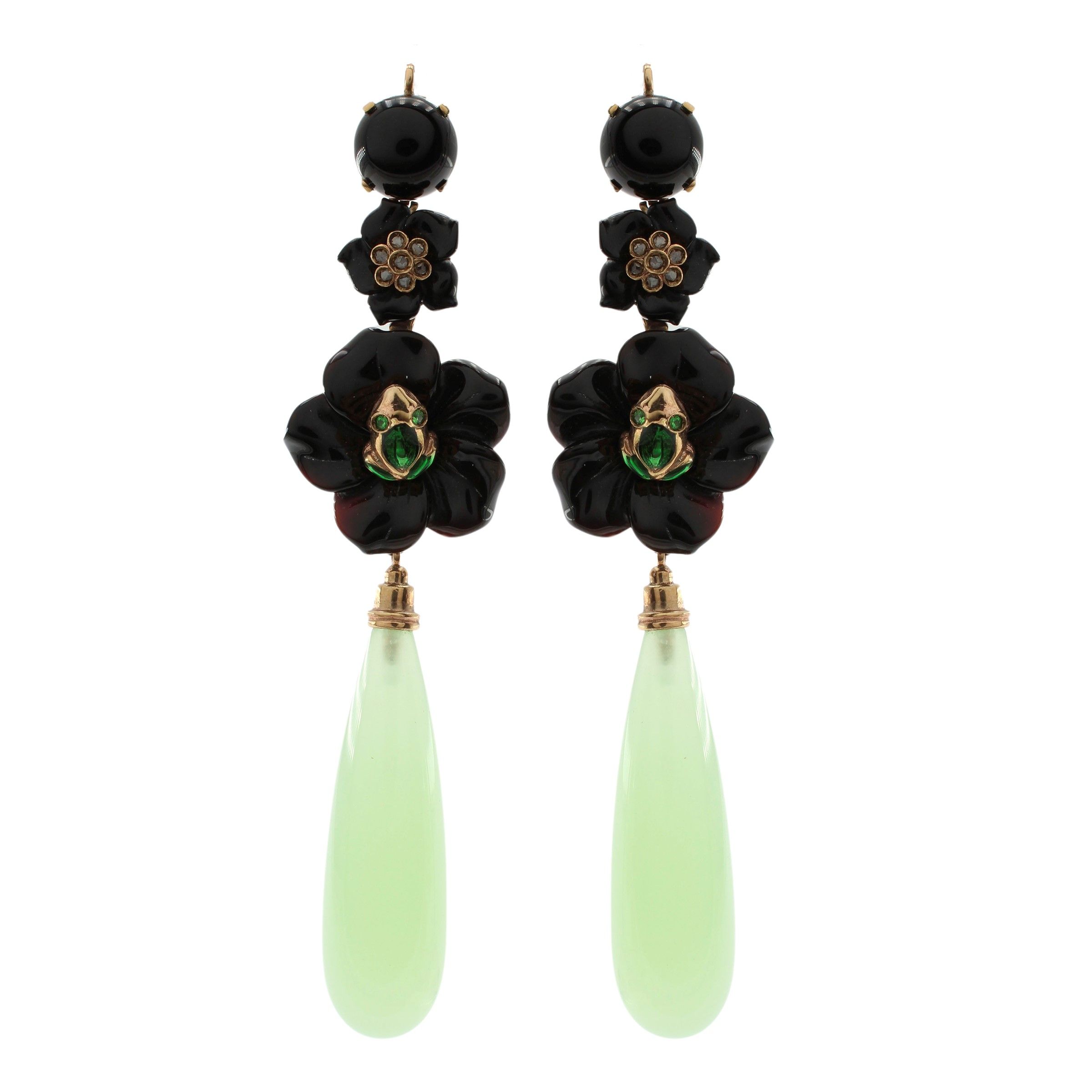 Orecchini pendenti rane in oro 9kt, onice nero, rose di diamante, smalto e smera [..]