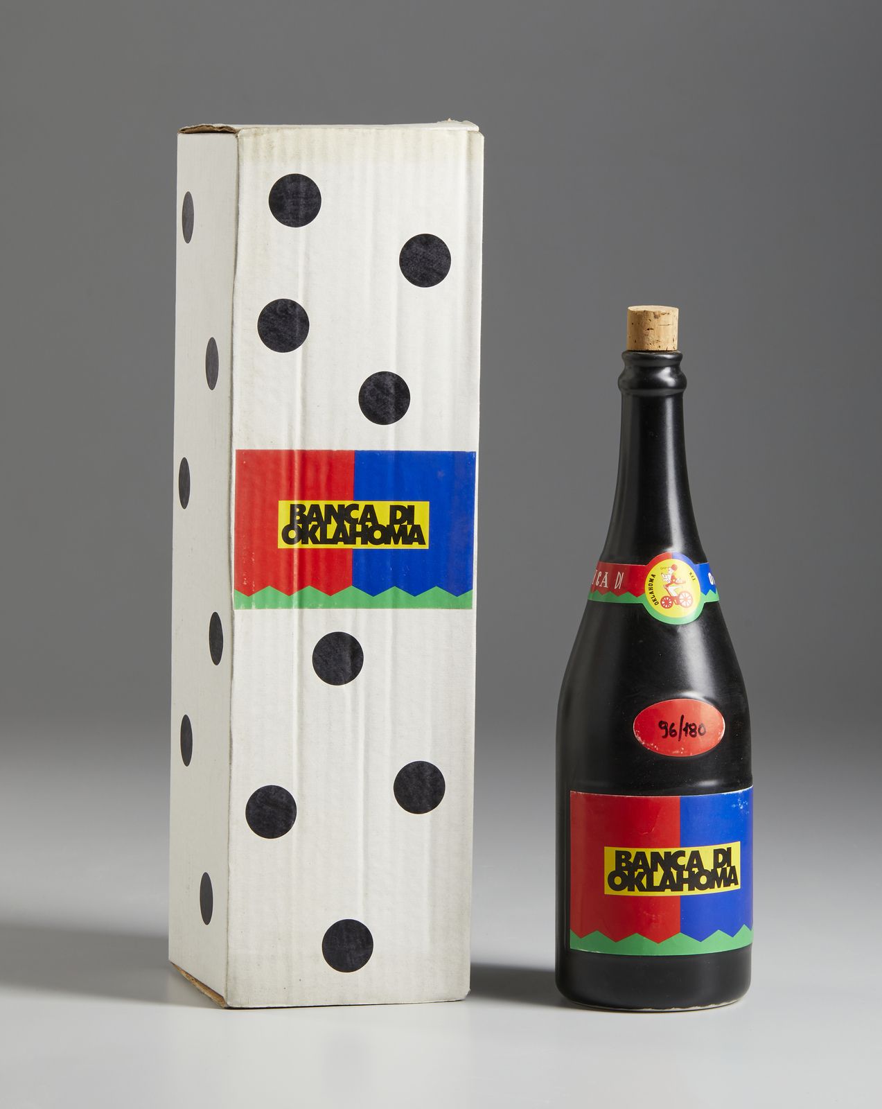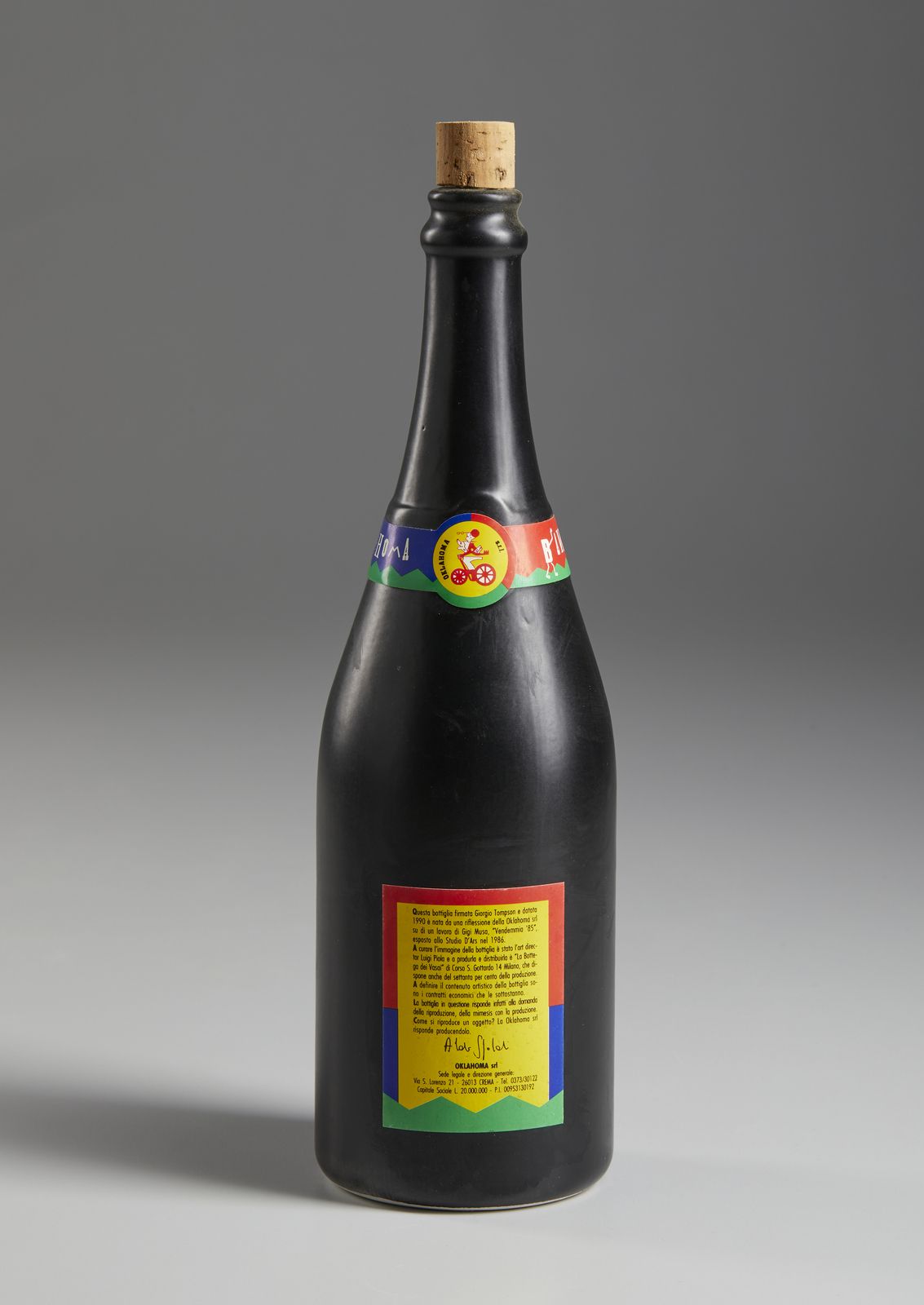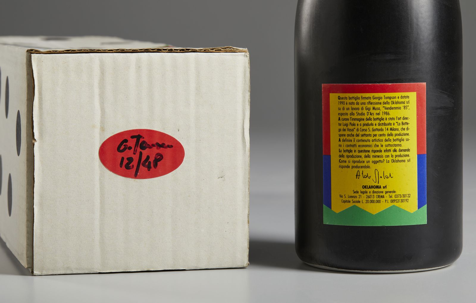 96/180. firma. La bottiglia, firmata Giorgio Tompson, è una riflessione della Oklahoma srl sull'opera ''Vendemmia '85'' di Gigi Musa. Prodotta e distribuita da La Bottega dei Vasai, Milano.