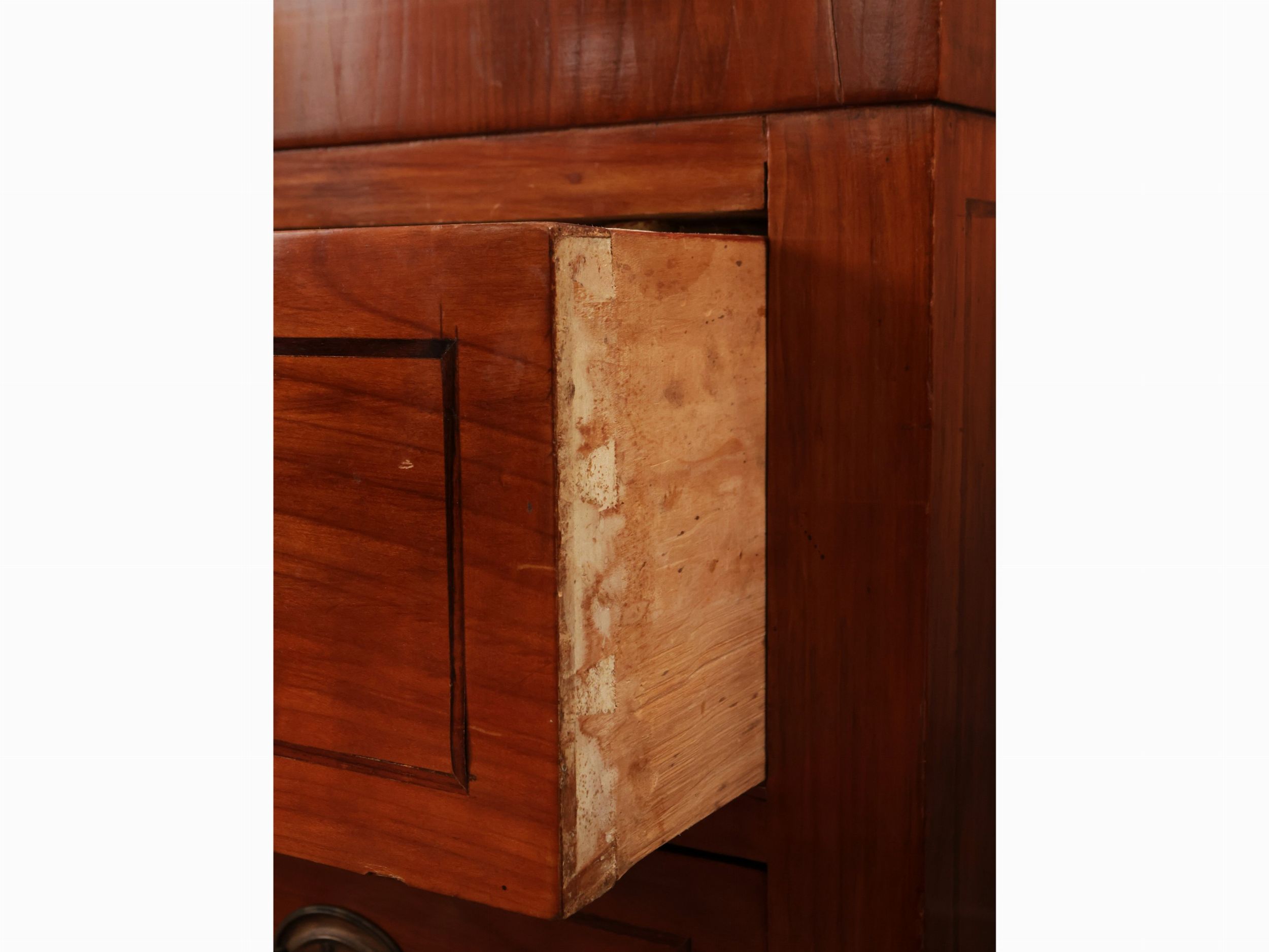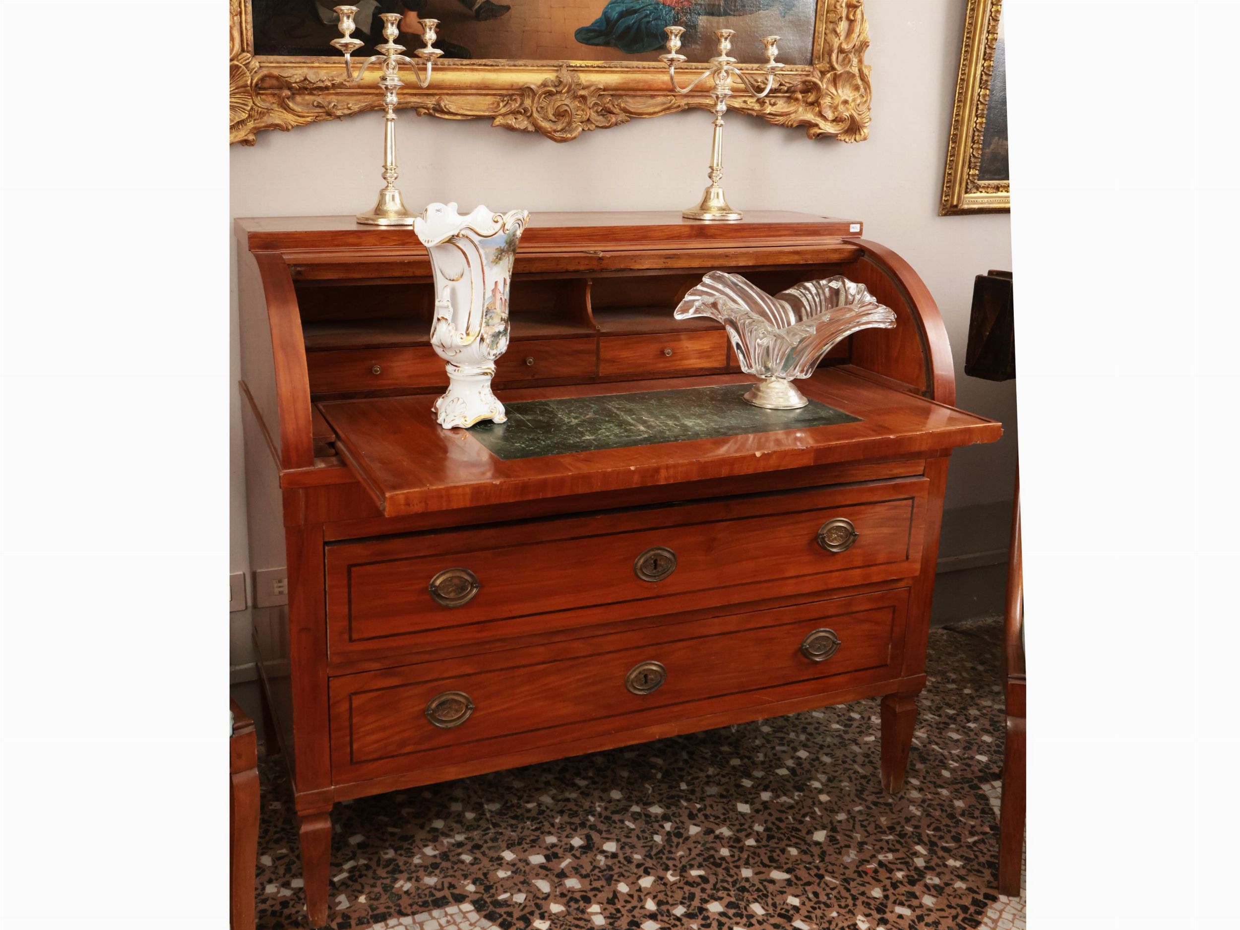 fine del XVIII secolo intarsiato con filettature, scarabattolo con cassettini e vani, piano estraibile in parte rivestito in cuoio verde, due cassetti sul fronte dritto, piedi a faretra, lievi difetti