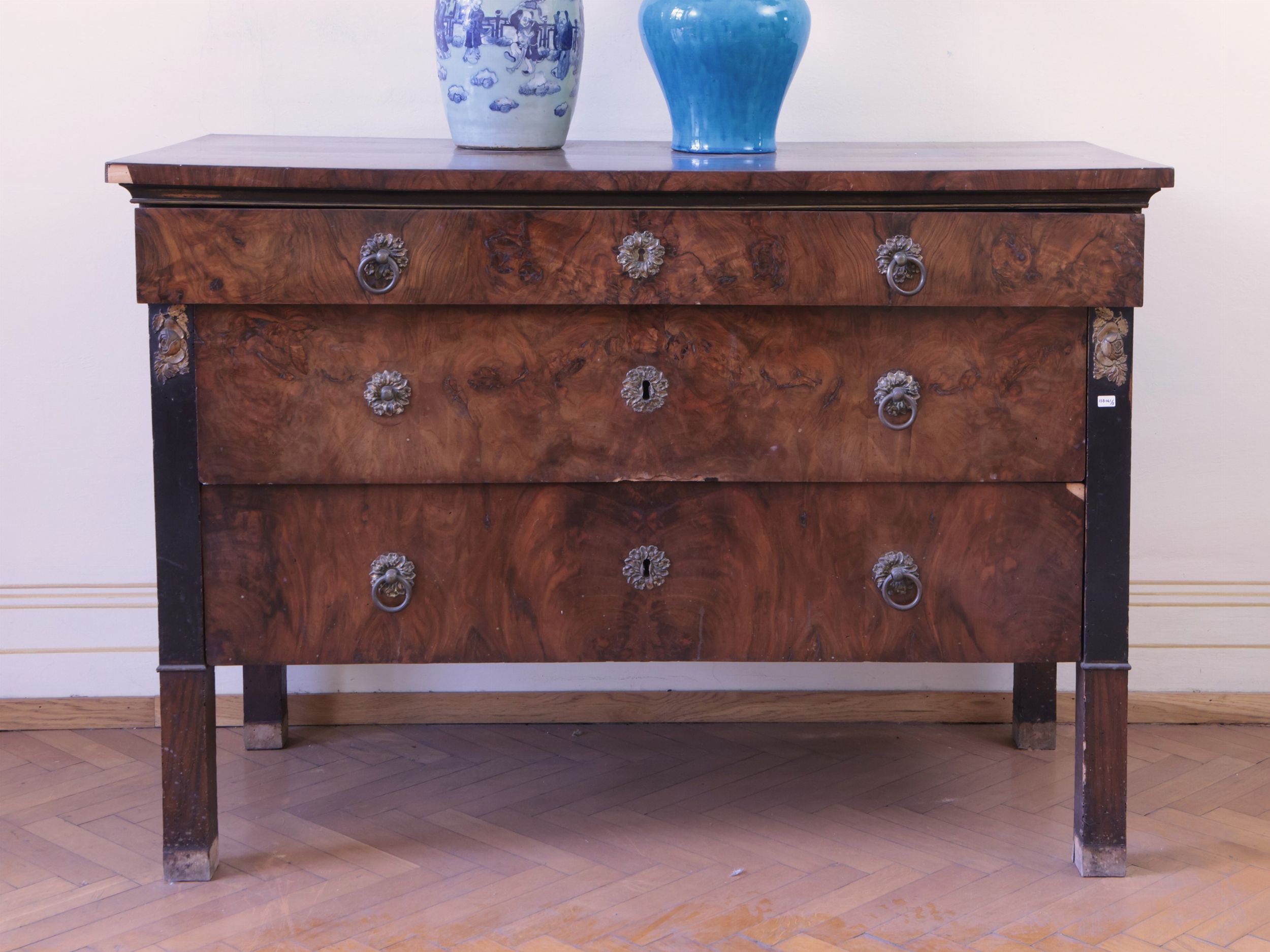 inizio del XIX secolo tre cassetti sul fronte dritto tra lesene piatte ebanizzate, piedi a plinto, applicazioni in tôle dorata, alcuni difetti