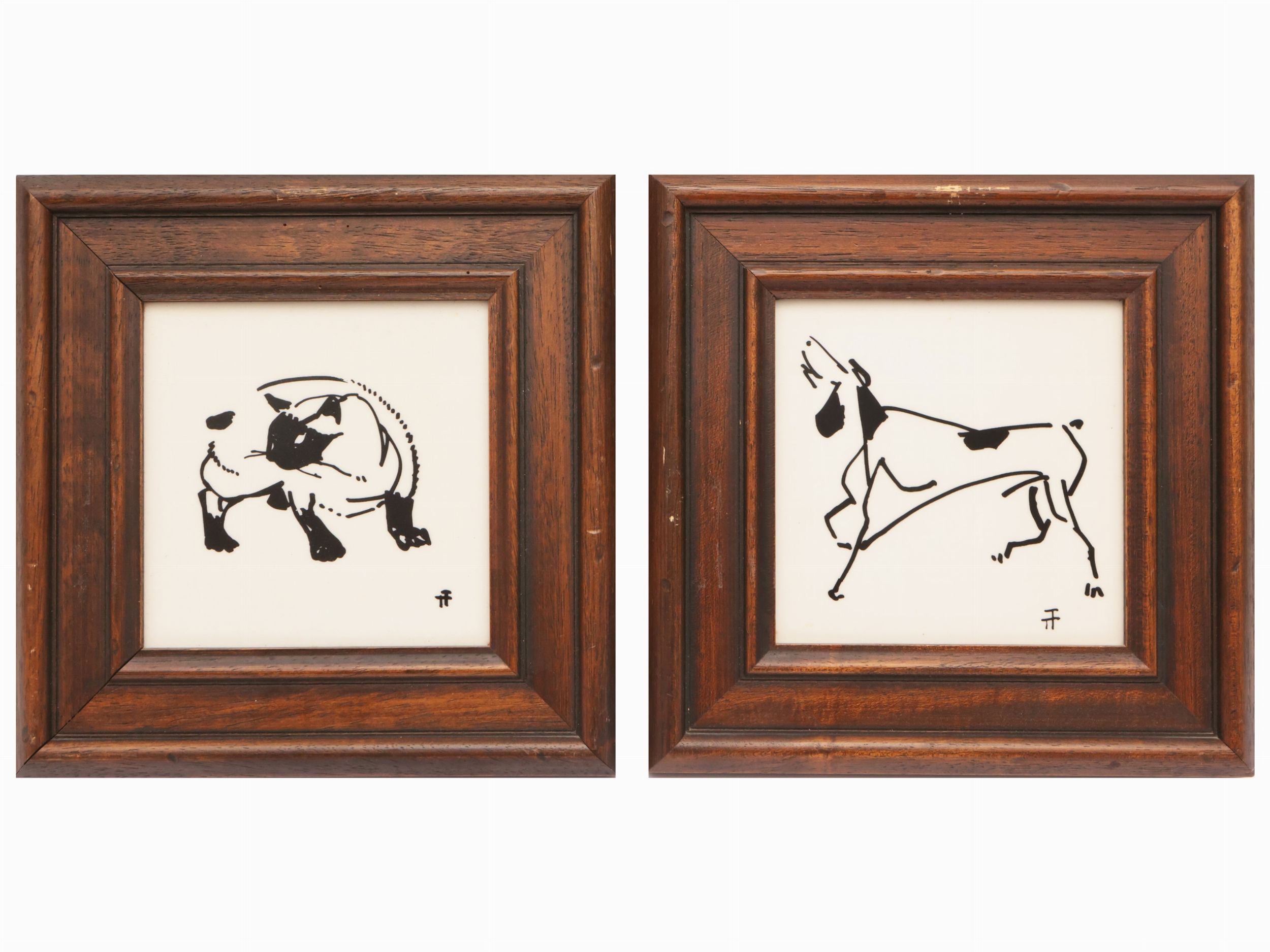 riproduzioni serigrafiche su ceramica raffiguranti un cane ed un gatto, in cornice