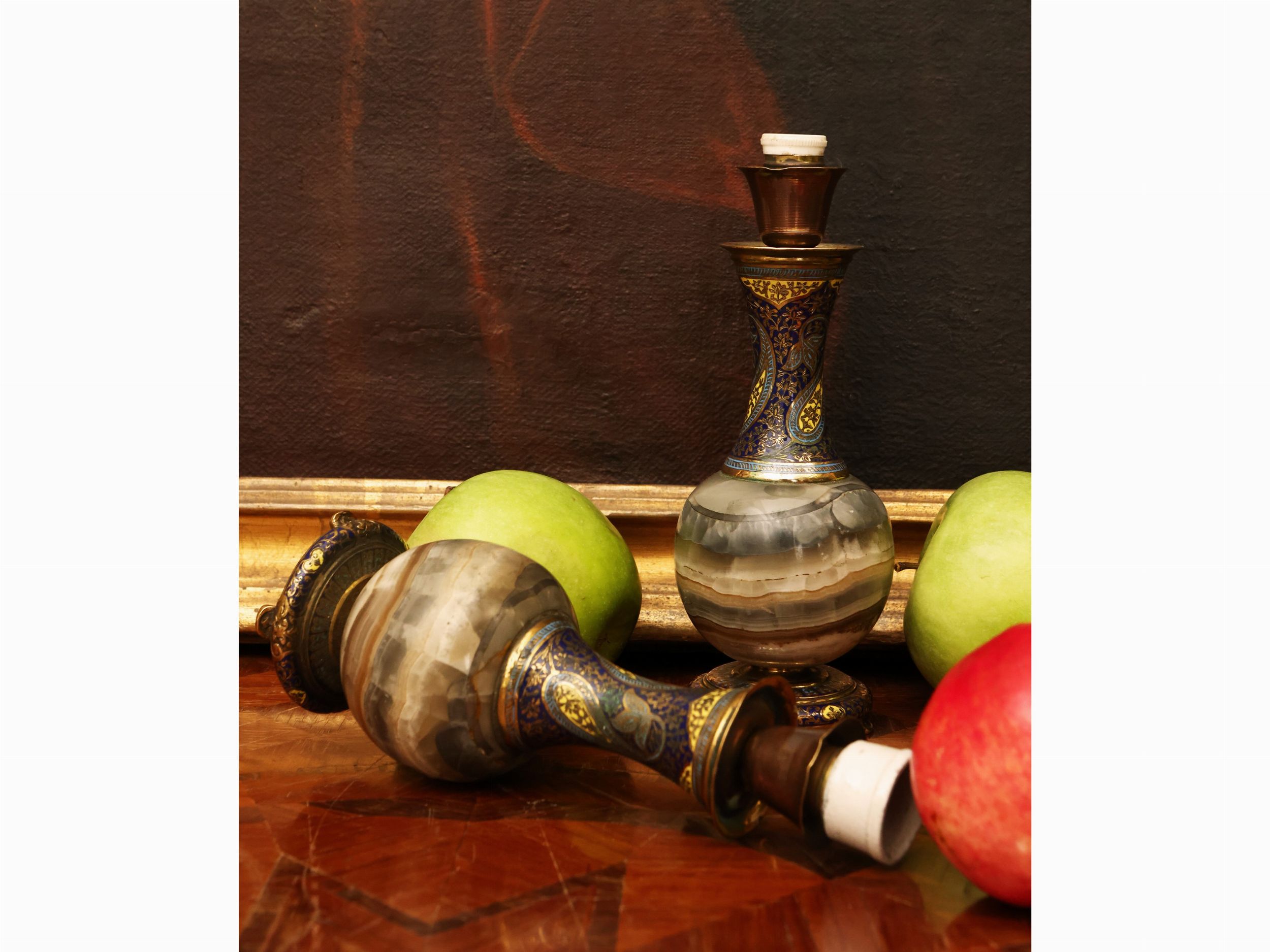 Coppia di piccoli lumi in onice, bronzo e smalti