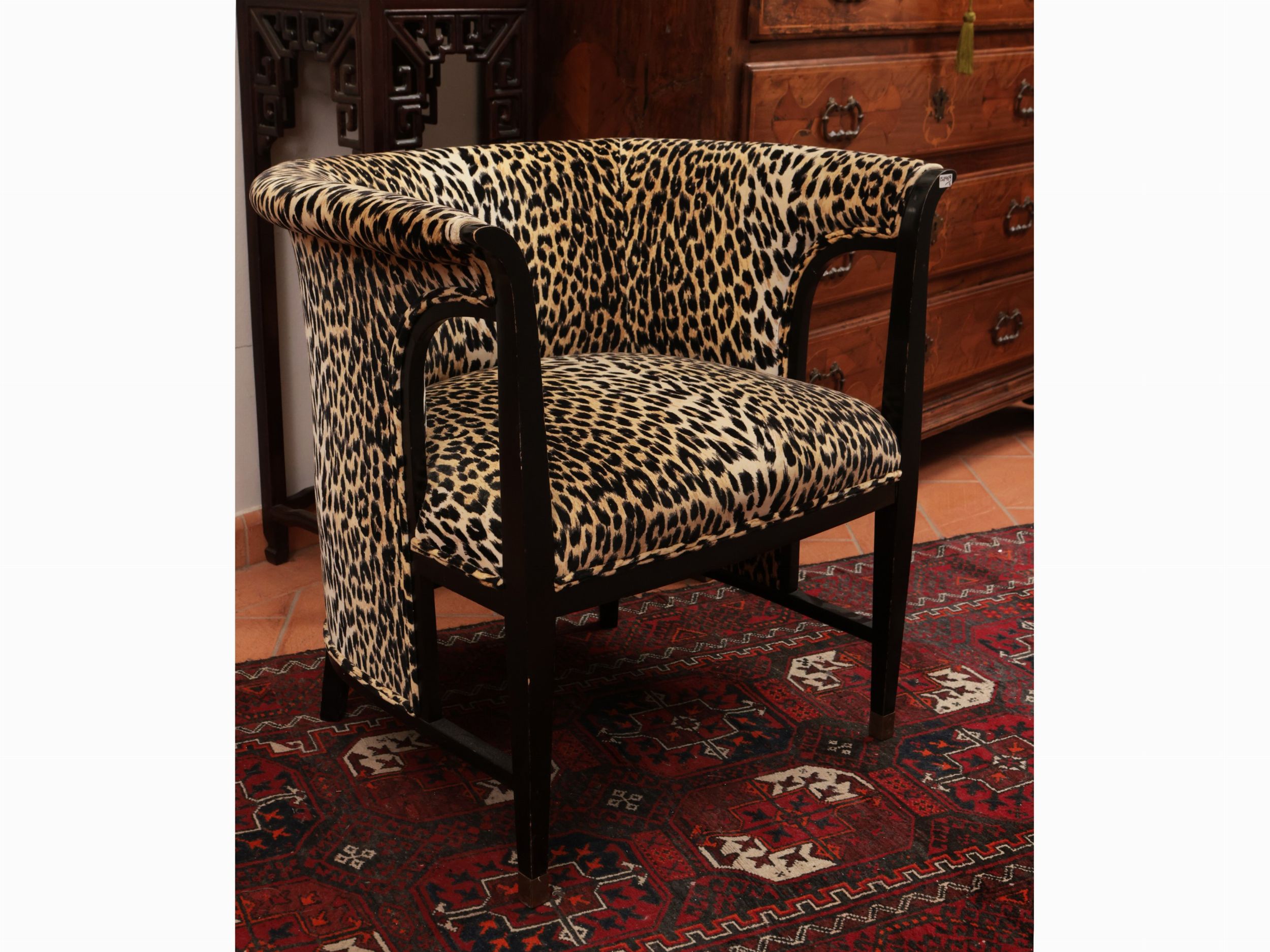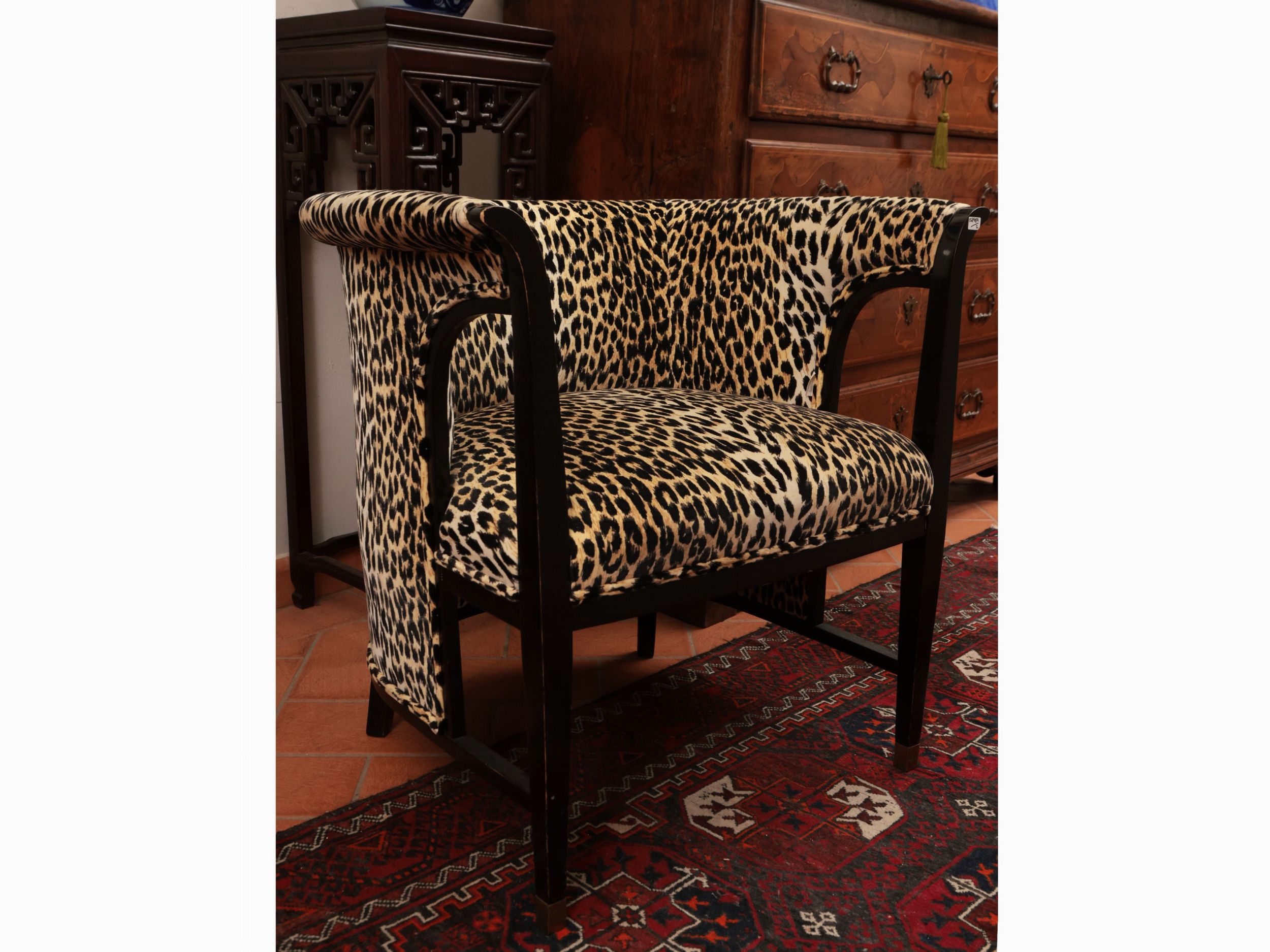 XX secolo seduta e schienale sinuosi e rivestiti in tessuto animalier, lievi difetti