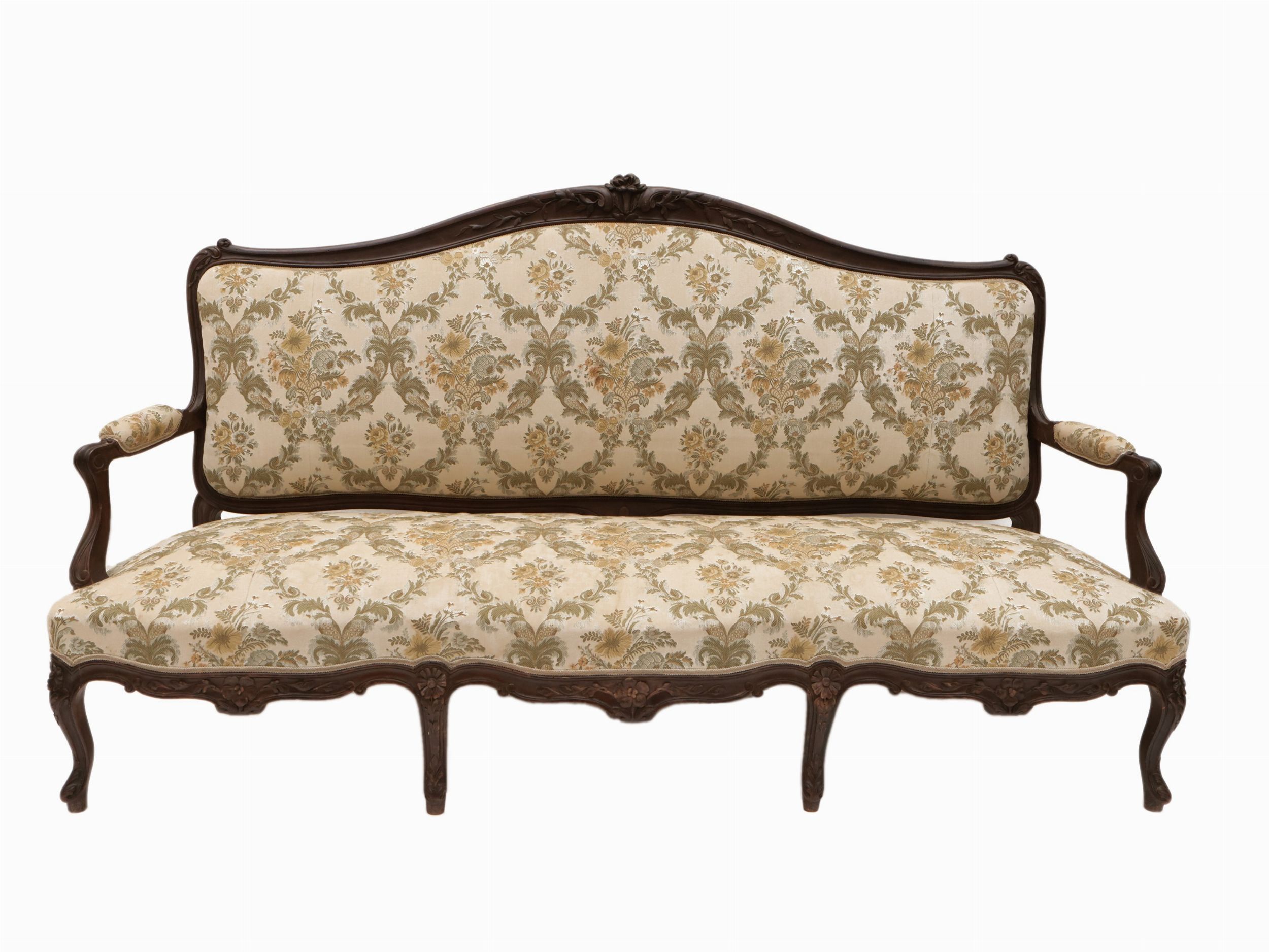 inizio del XX secolo schienale sagomato intagliato con motivo floreale, rivestito in tessuto damascato color avorio con motivi floreali entro ghirlande di foglie, braccioli a giorno, gambe mosse