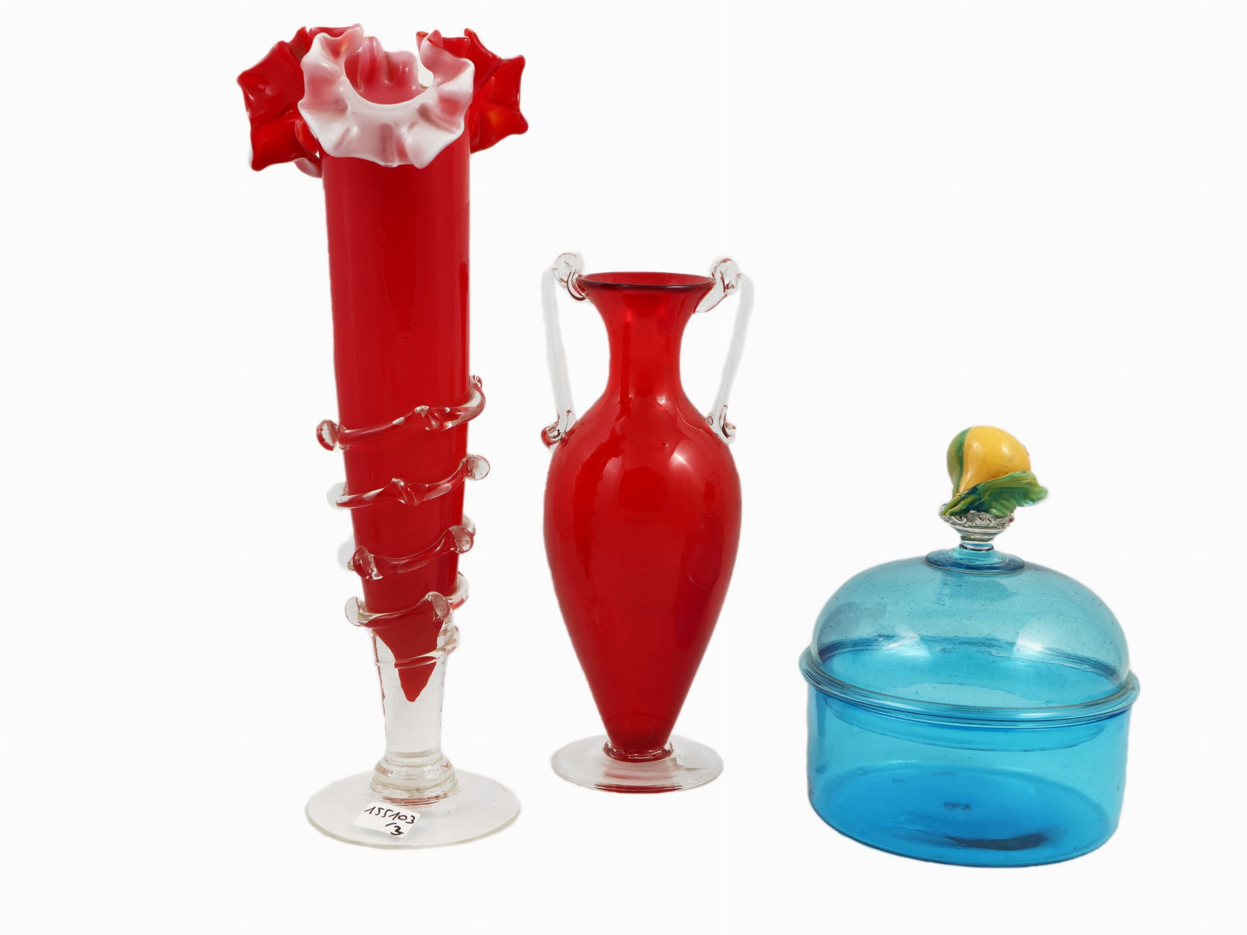 Italia, prima metà del XX sec. uno a tromba in vetro doppio ed uno realizzato ad anfora, abbinati ad una scatola circolare in vetro soffiato turchese, presa in pasta di vetro a foggia di frutto (lieve mancanza)