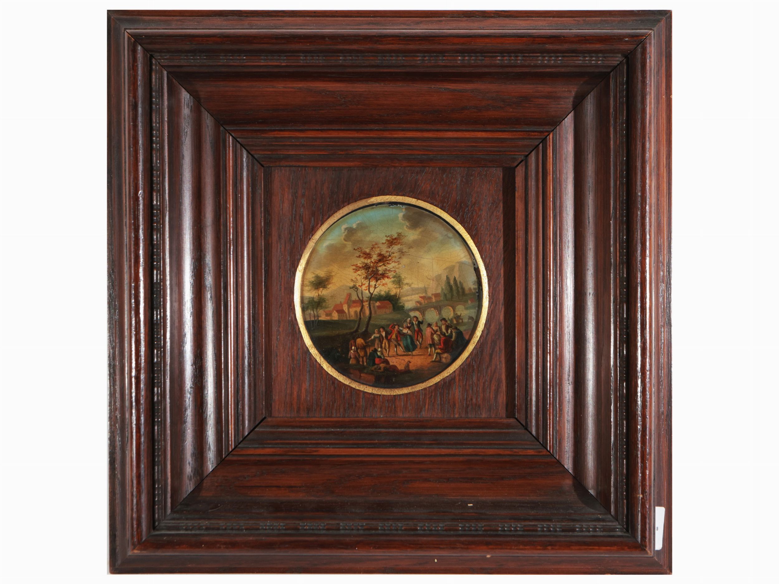 XIX/XX secolo miniatura dipinta in tondo nel gusto della pittura fiamminga del XVII secolo, in cornice, alcuni difetti lungo i margini