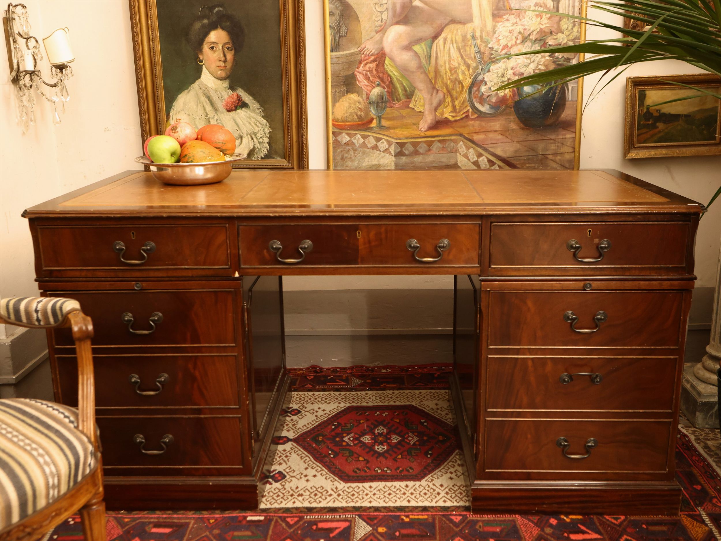 Grande scrivania a banco da centro in piuma di mogano