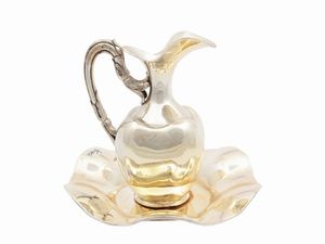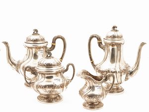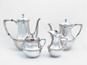 gr 1930, h da cm 15 a cm 24,5 (3) composto da due caffettiere a scalare e zuccheriera, corpo baccellato con bordi [..]