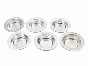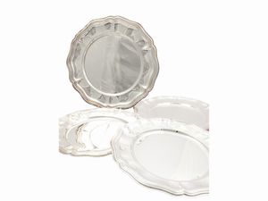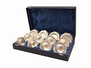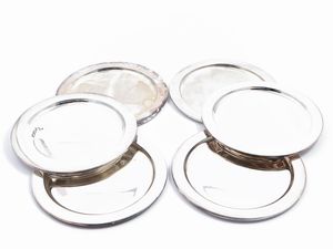 gr 4690, diam cm 30 e diam cm 34 (9) corredati da buste, abbinati a tre vassoietti di servizio simili di dimensioni [..]