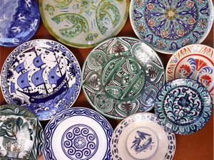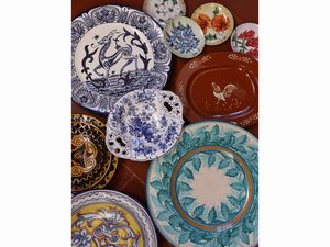 Undici piatti decorativi in terraglia, porcellana e ceramica