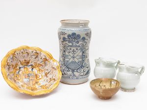 albarello h cm 31,5, ciotole da diam cm 13 a cm 28 (5) XVIII/XIX secolo composto da un albarello dipinto in monocromia [..]