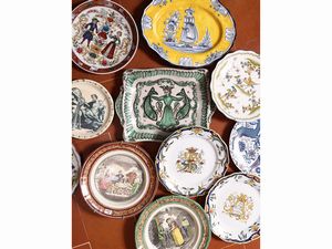 Dieci piatti decorativi in terraglia, porcellana e ceramica